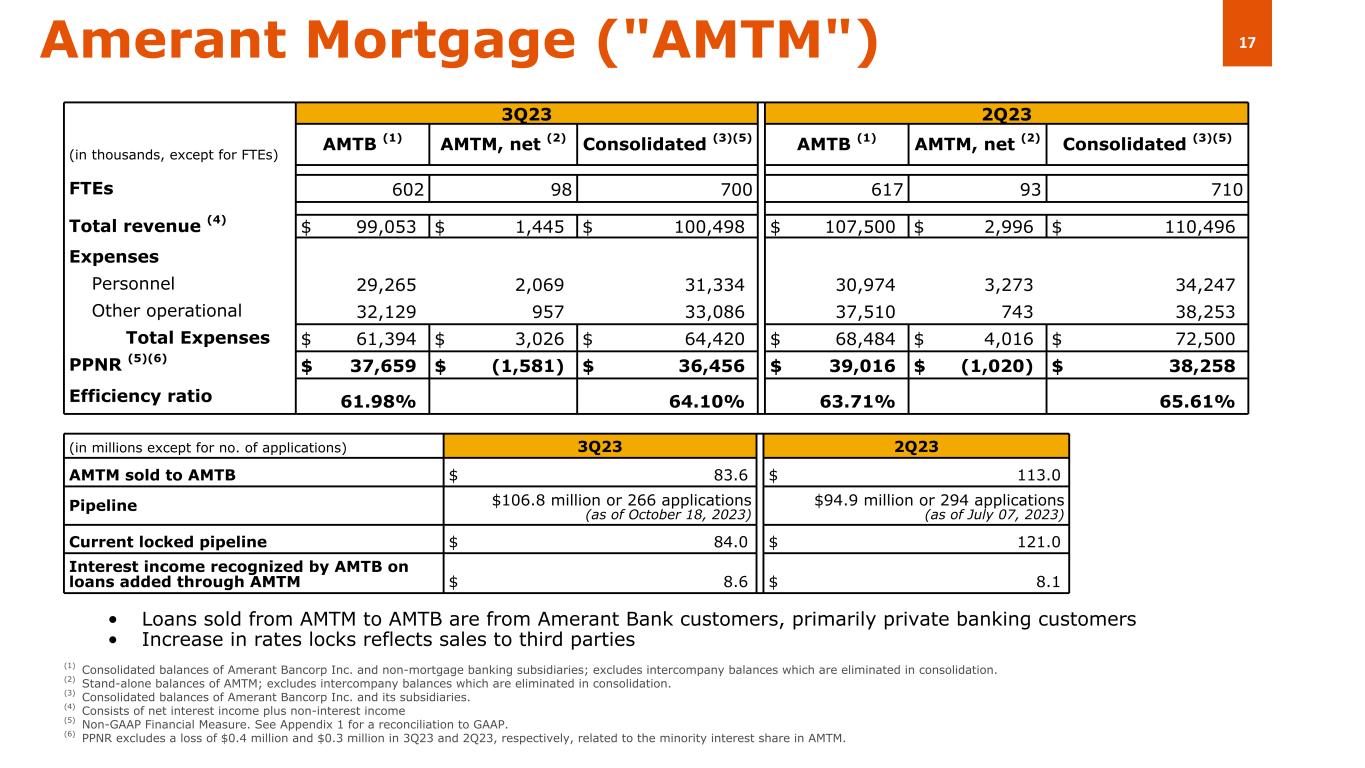 16 • Noninterest expense decreased in 3Q23 primarily due to: – the absence of the loss on sale of repossessed assets in 2Q23 in connection with our equipment-financing activities – the absence of additional expenses in 2Q23 in connection with the termination of contracts with third party vendors resulting from the engagement of FIS – lower advertising expenses resulting from campaigns in connection with our partnerships with professional sporting teams – the absence of the additional telecommunication and data processing expenses due to disposition of fixed assets in 2Q23 – the absence of the $2.0 million impairment charge related to an investment carried at cost – lower professional fees in connection with call center services that are no longer needed as a result of the engagement with FIS and the absence of the additional consulting expenses in 2Q23 – the absence of accelerated depreciation of leasehold improvements in 2Q23 in connection with the closure of a branch in Miami, FL in 2023 • Core noninterest expense(1), which excludes $6.3 million in non-routine items, was $58.1 million in 3Q23 $56.1 $62.2 $64.7 $72.5 $64.4 $30.1 $32.8 $34.9 $34.2 $31.3 $26.0 $29.4 $29.8 $38.3 $33.1 3Q22 4Q22 1Q23 2Q23 3Q23 50 Noninterest Expense Noninterest Expense Mix Commentary Other operating expensesSalaries and employee benefits FTE ($ in millions, except for FTEs) FTEs by company 3Q22 4Q22 1Q23 2Q23 3Q23 Amerant Bank and other subsidiaries 614 624 628 617 602 Amerant Mortgage 67 68 94 93 98 TOTAL 681 692 722 710 700 (1) Non-GAAP Financial Measure. See Appendix 1 for a reconciliation to GAAP. Non-routine Noninterest Expenses $2.0 $2.4 $3.4 $13.4 $6.3 Non-routine noninterest expense items 3Q22 4Q22 1Q23 2Q23 3Q23 0 20 ($ in millions)