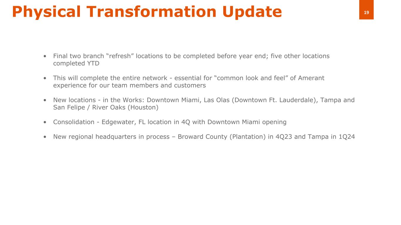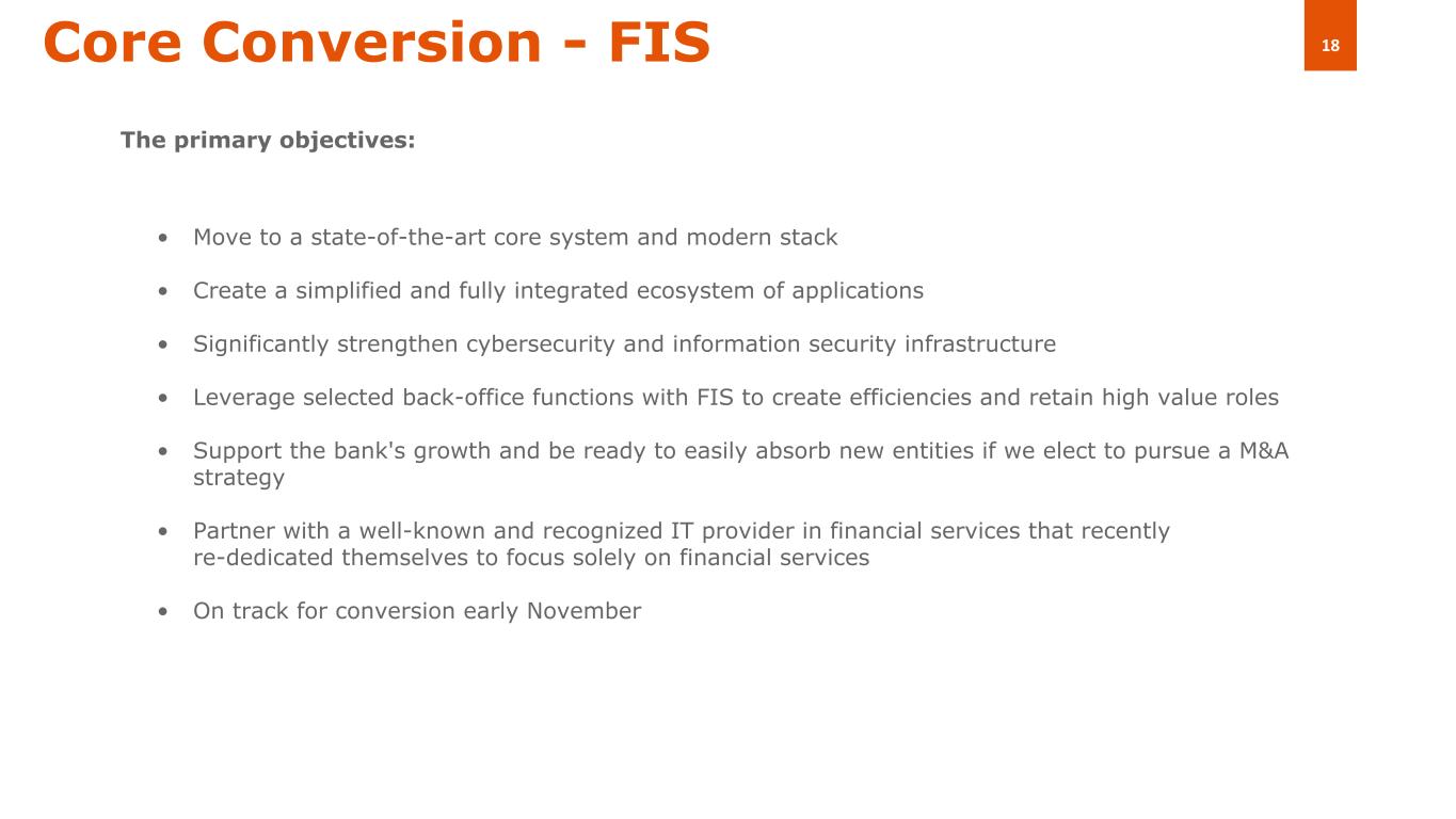 18Core Conversion - FIS The primary objectives: • Move to a state-of-the-art core system and modern stack • Create a simplified and fully integrated ecosystem of applications • Significantly strengthen cybersecurity and information security infrastructure • Leverage selected back-office functions with FIS to create efficiencies and retain high value roles • Support the bank's growth and be ready to easily absorb new entities if we elect to pursue a M&A strategy • Partner with a well-known and recognized IT provider in financial services that recently re-dedicated themselves to focus solely on financial services • On track for conversion early November