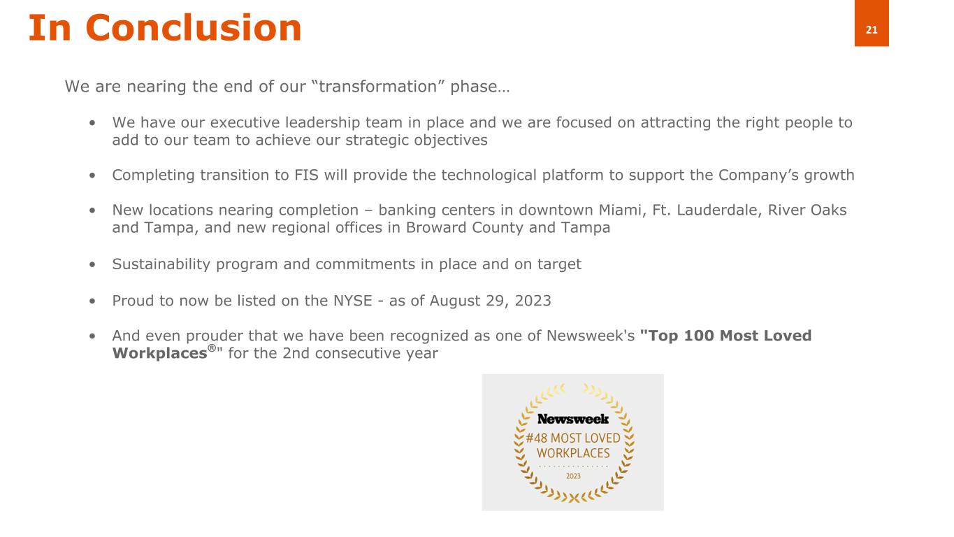 21In Conclusion We are nearing the end of our “transformation” phase… • We have our executive leadership team in place and we are focused on attracting the right people to add to our team to achieve our strategic objectives • Completing transition to FIS will provide the technological platform to support the Company’s growth • New locations nearing completion – banking centers in downtown Miami, Ft. Lauderdale, River Oaks and Tampa, and new regional offices in Broward County and Tampa • Sustainability program and commitments in place and on target • Proud to now be listed on the NYSE - as of August 29, 2023 • And even prouder that we have been recognized as one of Newsweek's "Top 100 Most Loved Workplaces®" for the 2nd consecutive year