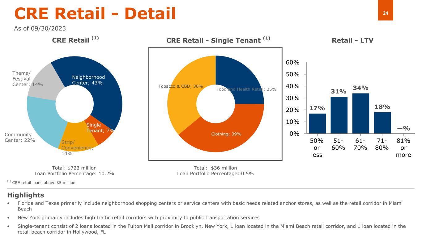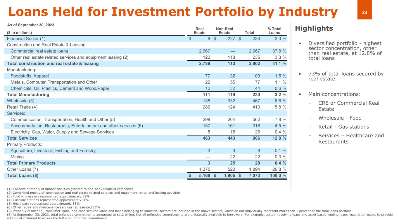 23Loans Held for Investment Portfolio by Industry • Diversified portfolio - highest sector concentration, other than real estate, at 12.8% of total loans • 73% of total loans secured by real estate • Main concentrations: – CRE or Commercial Real Estate – Wholesale - Food – Retail - Gas stations – Services – Healthcare and Restaurants Highlights (1) Consists primarily of finance facilities granted to non-bank financial companies. (2) Comprised mostly of construction and real estate related services and equipment rental and leasing activities (3) Food wholesalers represented approximately 39% (4) Gasoline stations represented approximately 56% (5) Healthcare represented approximately 55% (6) Other repair and maintenance services represented 27% (7) Primarily residential, consumer loans, and cash secured loans and loans belonging to industrial sectors not included in the above sectors, which do not individually represent more than 1 percent of the total loans portfolio (8) At September 30, 2023, total unfunded commitments amounted to $1.2 billion. Not all unfunded commitments are unilaterally available to borrowers. For example, certain revolving loans and asset based lending loans require borrowers to provide additional collateral to access the full amount of the commitment ($ in millions) Real Estate Non-Real Estate Total % Total Loans Financial Sector (1) $ 6 $ 227 $ 233 3.3 % Construction and Real Estate & Leasing: Commercial real estate loans 2,667 — 2,667 37.8 % Other real estate related services and equipment leasing (2) 122 113 235 3.3 % Total construction and real estate & leasing 2,789 113 2,902 41.1 % Manufacturing: Foodstuffs, Apparel 77 32 109 1.5 % Metals, Computer, Transportation and Other 22 55 77 1.1 % Chemicals, Oil, Plastics, Cement and Wood/Paper 12 32 44 0.6 % Total Manufacturing 111 119 230 3.2 % Wholesale (3) 135 332 467 6.6 % Retail Trade (4) 286 124 410 5.8 % Services: Communication, Transportation, Health and Other (5) 298 264 562 7.9 % Accommodation, Restaurants, Entertainment and other services (6) 157 161 318 4.5 % Electricity, Gas, Water, Supply and Sewage Services 8 18 26 0.4 % Total Services 463 443 906 12.8 % Primary Products: Agriculture, Livestock, Fishing and Forestry 3 3 6 0.1 % Mining — 22 22 0.3 % Total Primary Products 3 25 28 0.4 % Other Loans (7) 1,375 522 1,894 26.8 % Total Loans (8) $ 5,168 $ 1,905 $ 7,073 100.0 % As of September 30, 2023