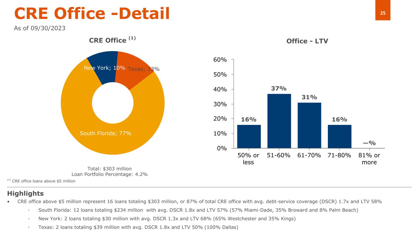 24 17% 31% 34% 18% —% 50% or less 51- 60% 61- 70% 71- 80% 81% or more 0% 10% 20% 30% 40% 50% 60% CRE Retail - Detail As of 09/30/2023 • Florida and Texas primarily include neighborhood shopping centers or service centers with basic needs related anchor stores, as well as the retail corridor in Miami Beach • New York primarily includes high traffic retail corridors with proximity to public transportation services • Single-tenant consist of 2 loans located in the Fulton Mall corridor in Brooklyn, New York, 1 loan located in the Miami Beach retail corridor, and 1 loan located in the retail beach corridor in Hollywood, FL Highlights CRE Retail (1) Retail - LTV Food and Health Retail; 25% Clothing; 39% Tobacco & CBD; 36% CRE Retail - Single Tenant (1) (1) CRE retail loans above $5 million Total: $723 million Loan Portfolio Percentage: 10.2% Total: $36 million Loan Portfolio Percentage: 0.5% Neighborhood Center; 43% Single Tenant; 7% Strip/ Convenience; 14% Community Center; 22% Theme/ Festival Center; 14%