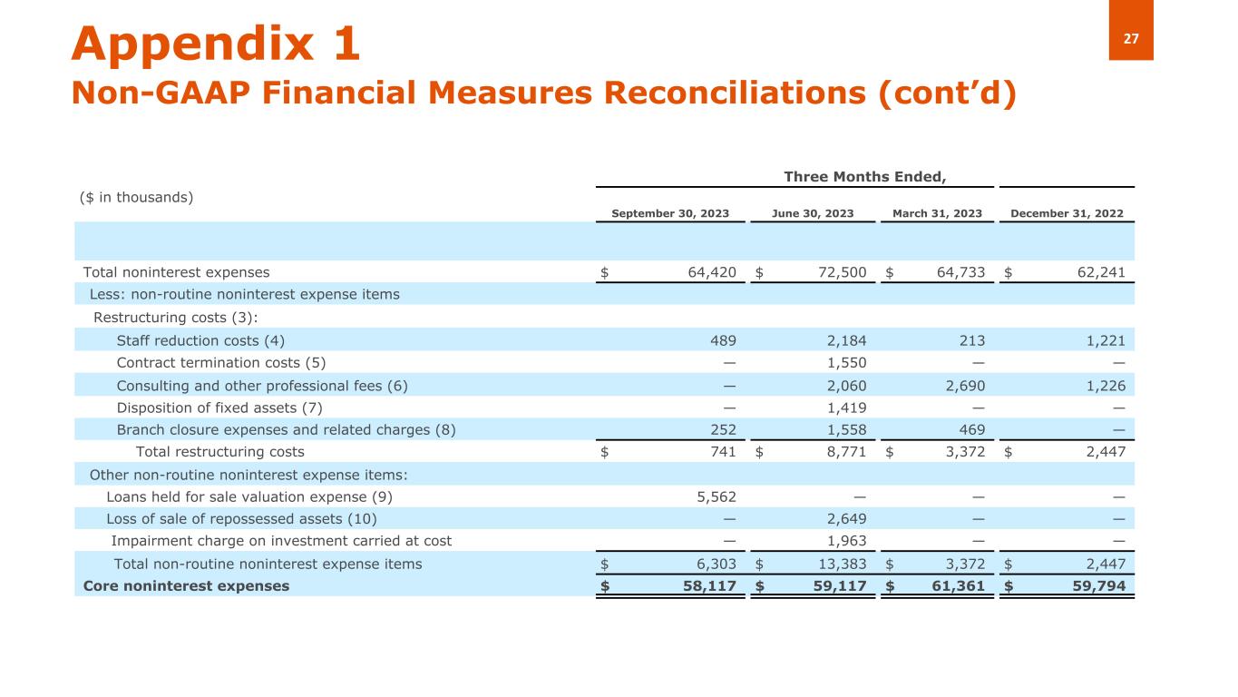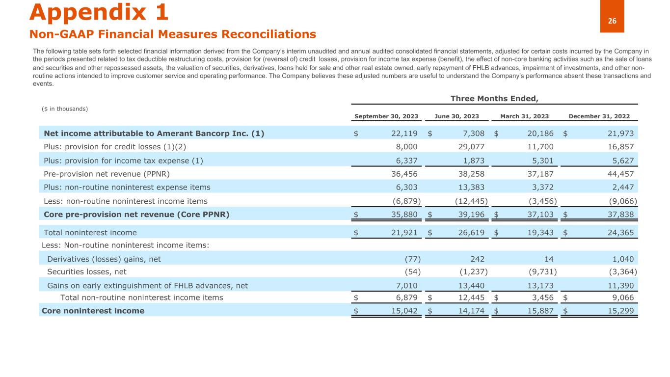 26Appendix 1 Non-GAAP Financial Measures Reconciliations The following table sets forth selected financial information derived from the Company’s interim unaudited and annual audited consolidated financial statements, adjusted for certain costs incurred by the Company in the periods presented related to tax deductible restructuring costs, provision for (reversal of) credit losses, provision for income tax expense (benefit), the effect of non-core banking activities such as the sale of loans and securities and other repossessed assets, the valuation of securities, derivatives, loans held for sale and other real estate owned, early repayment of FHLB advances, impairment of investments, and other non- routine actions intended to improve customer service and operating performance. The Company believes these adjusted numbers are useful to understand the Company’s performance absent these transactions and events. Three Months Ended, ($ in thousands) September 30, 2023 June 30, 2023 March 31, 2023 December 31, 2022 Net income attributable to Amerant Bancorp Inc. (1) $ 22,119 $ 7,308 $ 20,186 $ 21,973 Plus: provision for credit losses (1)(2) 8,000 29,077 11,700 16,857 Plus: provision for income tax expense (1) 6,337 1,873 5,301 5,627 Pre-provision net revenue (PPNR) 36,456 38,258 37,187 44,457 Plus: non-routine noninterest expense items 6,303 13,383 3,372 2,447 Less: non-routine noninterest income items (6,879) (12,445) (3,456) (9,066) Core pre-provision net revenue (Core PPNR) $ 35,880 $ 39,196 $ 37,103 $ 37,838 Total noninterest income $ 21,921 $ 26,619 $ 19,343 $ 24,365 Less: Non-routine noninterest income items: Derivatives (losses) gains, net (77) 242 14 1,040 Securities losses, net (54) (1,237) (9,731) (3,364) Gains on early extinguishment of FHLB advances, net 7,010 13,440 13,173 11,390 Total non-routine noninterest income items $ 6,879 $ 12,445 $ 3,456 $ 9,066 Core noninterest income $ 15,042 $ 14,174 $ 15,887 $ 15,299
