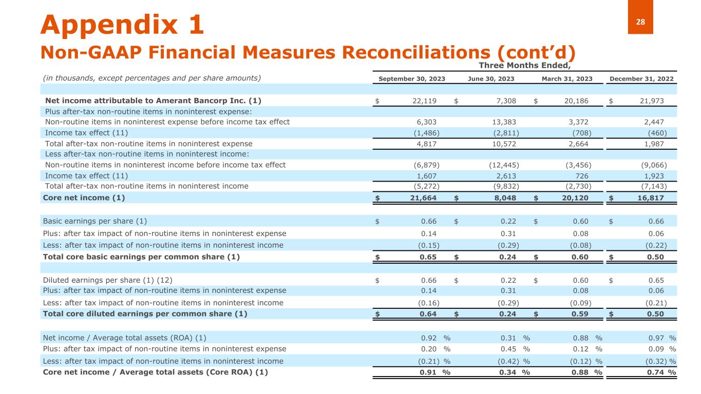 28Appendix 1 Non-GAAP Financial Measures Reconciliations (cont’d) Three Months Ended, (in thousands, except percentages and per share amounts) September 30, 2023 June 30, 2023 March 31, 2023 December 31, 2022 Net income attributable to Amerant Bancorp Inc. (1) $ 22,119 $ 7,308 $ 20,186 $ 21,973 Plus after-tax non-routine items in noninterest expense: Non-routine items in noninterest expense before income tax effect 6,303 13,383 3,372 2,447 Income tax effect (11) (1,486) (2,811) (708) (460) Total after-tax non-routine items in noninterest expense 4,817 10,572 2,664 1,987 Less after-tax non-routine items in noninterest income: Non-routine items in noninterest income before income tax effect (6,879) (12,445) (3,456) (9,066) Income tax effect (11) 1,607 2,613 726 1,923 Total after-tax non-routine items in noninterest income (5,272) (9,832) (2,730) (7,143) Core net income (1) $ 21,664 $ 8,048 $ 20,120 $ 16,817 Basic earnings per share (1) $ 0.66 $ 0.22 $ 0.60 $ 0.66 Plus: after tax impact of non-routine items in noninterest expense 0.14 0.31 0.08 0.06 Less: after tax impact of non-routine items in noninterest income (0.15) (0.29) (0.08) (0.22) Total core basic earnings per common share (1) $ 0.65 $ 0.24 $ 0.60 $ 0.50 Diluted earnings per share (1) (12) $ 0.66 $ 0.22 $ 0.60 $ 0.65 Plus: after tax impact of non-routine items in noninterest expense 0.14 0.31 0.08 0.06 Less: after tax impact of non-routine items in noninterest income (0.16) (0.29) (0.09) (0.21) Total core diluted earnings per common share (1) $ 0.64 $ 0.24 $ 0.59 $ 0.50 Net income / Average total assets (ROA) (1) 0.92 % 0.31 % 0.88 % 0.97 % Plus: after tax impact of non-routine items in noninterest expense 0.20 % 0.45 % 0.12 % 0.09 % Less: after tax impact of non-routine items in noninterest income (0.21) % (0.42) % (0.12) % (0.32) % Core net income / Average total assets (Core ROA) (1) 0.91 % 0.34 % 0.88 % 0.74 %