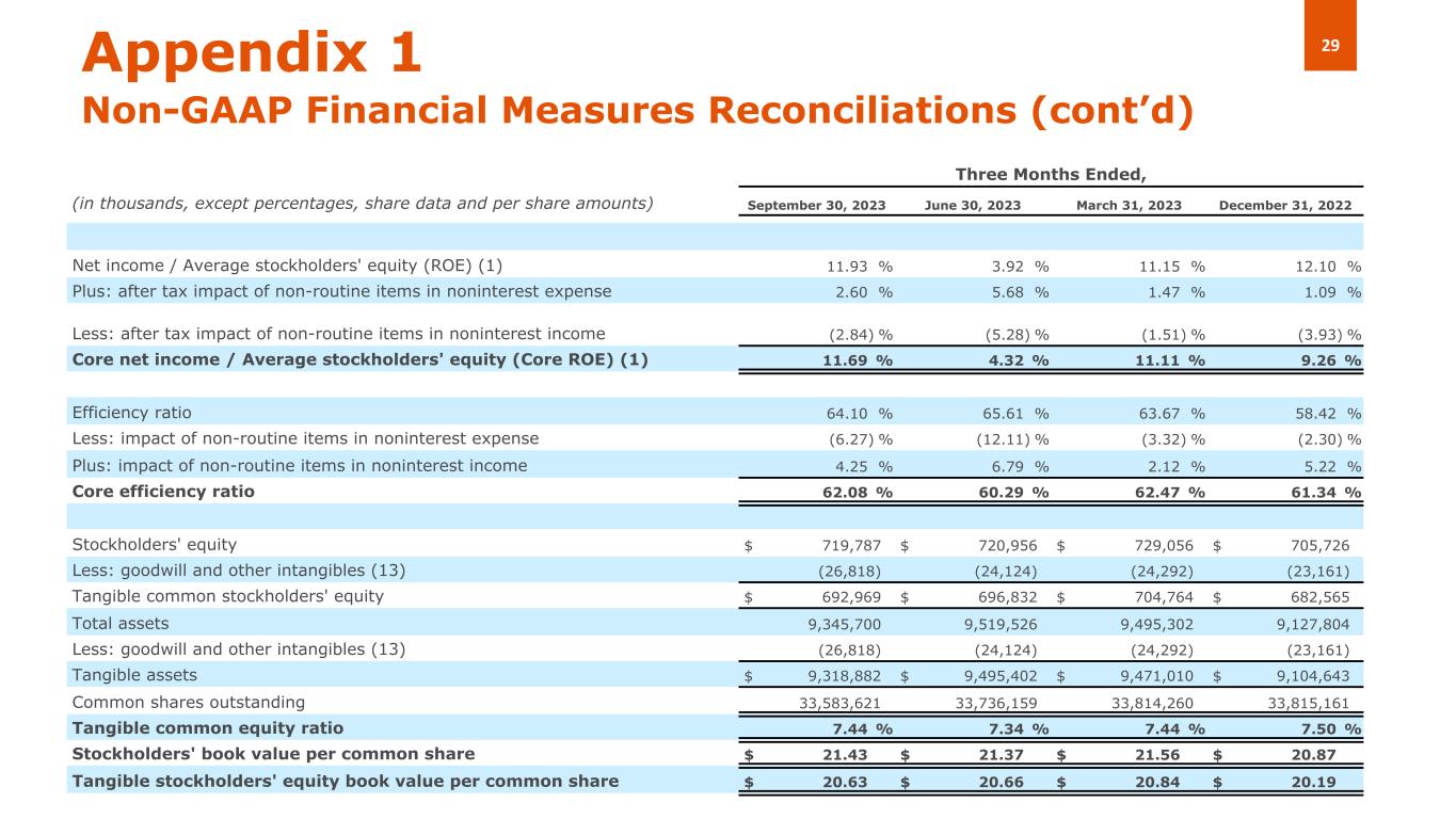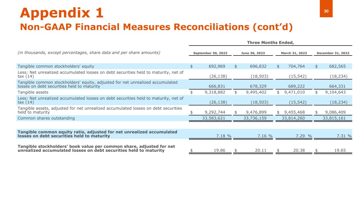 29Appendix 1 Non-GAAP Financial Measures Reconciliations (cont’d) Three Months Ended, (in thousands, except percentages, share data and per share amounts) September 30, 2023 June 30, 2023 March 31, 2023 December 31, 2022 Net income / Average stockholders' equity (ROE) (1) 11.93 % 3.92 % 11.15 % 12.10 % Plus: after tax impact of non-routine items in noninterest expense 2.60 % 5.68 % 1.47 % 1.09 % Less: after tax impact of non-routine items in noninterest income (2.84) % (5.28) % (1.51) % (3.93) % Core net income / Average stockholders' equity (Core ROE) (1) 11.69 % 4.32 % 11.11 % 9.26 % Efficiency ratio 64.10 % 65.61 % 63.67 % 58.42 % Less: impact of non-routine items in noninterest expense (6.27) % (12.11) % (3.32) % (2.30) % Plus: impact of non-routine items in noninterest income 4.25 % 6.79 % 2.12 % 5.22 % Core efficiency ratio 62.08 % 60.29 % 62.47 % 61.34 % Stockholders' equity $ 719,787 $ 720,956 $ 729,056 $ 705,726 Less: goodwill and other intangibles (13) (26,818) (24,124) (24,292) (23,161) Tangible common stockholders' equity $ 692,969 $ 696,832 $ 704,764 $ 682,565 Total assets 9,345,700 9,519,526 9,495,302 9,127,804 Less: goodwill and other intangibles (13) (26,818) (24,124) (24,292) (23,161) Tangible assets $ 9,318,882 $ 9,495,402 $ 9,471,010 $ 9,104,643 Common shares outstanding 33,583,621 33,736,159 33,814,260 33,815,161 Tangible common equity ratio 7.44 % 7.34 % 7.44 % 7.50 % Stockholders' book value per common share $ 21.43 $ 21.37 $ 21.56 $ 20.87 Tangible stockholders' equity book value per common share $ 20.63 $ 20.66 $ 20.84 $ 20.19