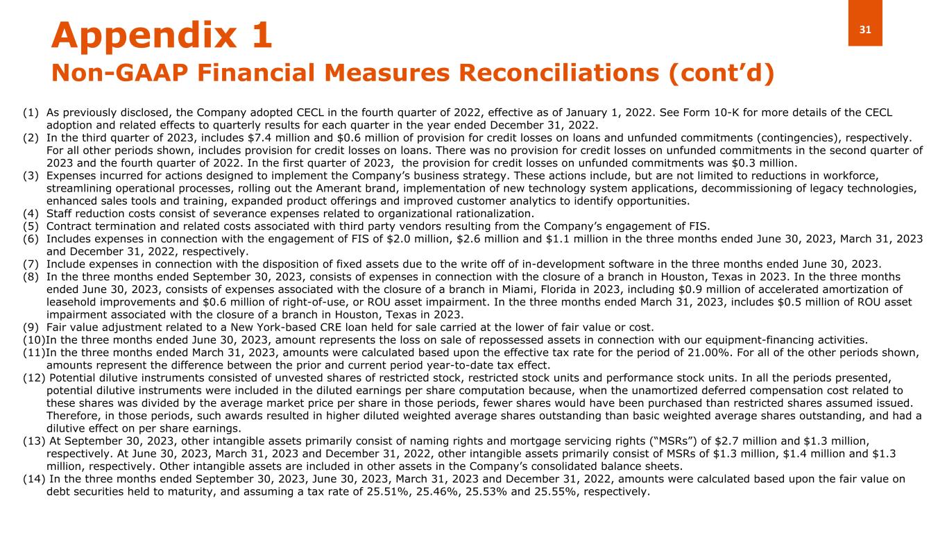 30Appendix 1 Non-GAAP Financial Measures Reconciliations (cont’d) Three Months Ended, (in thousands, except percentages, share data and per share amounts) September 30, 2023 June 30, 2023 March 31, 2023 December 31, 2022 Tangible common stockholders' equity $ 692,969 $ 696,832 $ 704,764 $ 682,565 Less: Net unrealized accumulated losses on debt securities held to maturity, net of tax (14) (26,138) (18,503) (15,542) (18,234) Tangible common stockholders' equity, adjusted for net unrealized accumulated losses on debt securities held to maturity 666,831 678,329 689,222 664,331 Tangible assets $ 9,318,882 $ 9,495,402 $ 9,471,010 $ 9,104,643 Less: Net unrealized accumulated losses on debt securities held to maturity, net of tax (14) (26,138) (18,503) (15,542) (18,234) Tangible assets, adjusted for net unrealized accumulated losses on debt securities held to maturity $ 9,292,744 $ 9,476,899 $ 9,455,468 $ 9,086,409 Common shares outstanding 33,583,621 33,736,159 33,814,260 33,815,161 Tangible common equity ratio, adjusted for net unrealized accumulated losses on debt securities held to maturity 7.18 % 7.16 % 7.29 % 7.31 % Tangible stockholders' book value per common share, adjusted for net unrealized accumulated losses on debt securities held to maturity $ 19.86 $ 20.11 $ 20.38 $ 19.65