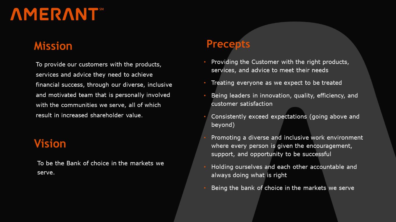 3Performance Highlights 3Q23 Business • Net income attributable to the Company was $22.1 million in 3Q23 compared to $7.3 million in 2Q23 • Pre-provision net revenue was $36.5 million in 3Q23 compared to $38.3 million in 2Q23 • Diluted earnings per share (EPS) was $0.66 in 3Q23 compared to $0.22 in 2Q23 • Net Interest Margin (“NIM”) was 3.57% in 3Q23 compared to 3.83% in 2Q23 • Total assets were $9.3 billion, a decrease of $173.8 million, or 1.8%, compared to 2Q23 • Total gross loans were $7.14 billion, a decrease of $74.4 million, or 1.0%, compared to $7.22 billion in 2Q23 • Average yield on loans slightly down to 6.77% in 3Q23 compared to 6.79% in 2Q23 • Total deposits were $7.55 billion, a decrease of $32.7 million, or 0.4%, compared to $7.58 billion in 2Q23. • Core deposits were $5.24 billion, down $254.0 million, or 4.6%, compared to $5.50 billion as of 2Q23. The decrease in 3Q23 includes reductions in institutional deposits of $292 million • Average cost of total deposits increased to 2.66% in 3Q23 compared to 2.40% in 2Q23 • Loan to deposit ratio improved to 94.64% compared to 95.22% in 2Q23 • FHLB advances were $595.0 million, a decrease of $175.0 million, or 22.7%%, compared to $770.0 million in 2Q23 due to prepayments during 3Q23, as part of asset/liability management • Assets under management totaled $2.09 billion, down $55.3 million, or 2.6%, compared to $2.15 billion in 2Q23 Earnings Capital • All capital ratios continue to be substantially above "well-capitalized" levels • Quarterly cash dividend of $0.09 per share of Amerant common stock paid out on August 31, 2023 • Repurchased 142,888 shares for $2.7 million in 3Q23 and an aggregate of 259,853 shares for $4.9 million YTD (average price of $18.98 per share or 0.9X Price to Book Value); $20 million available as 3Q23