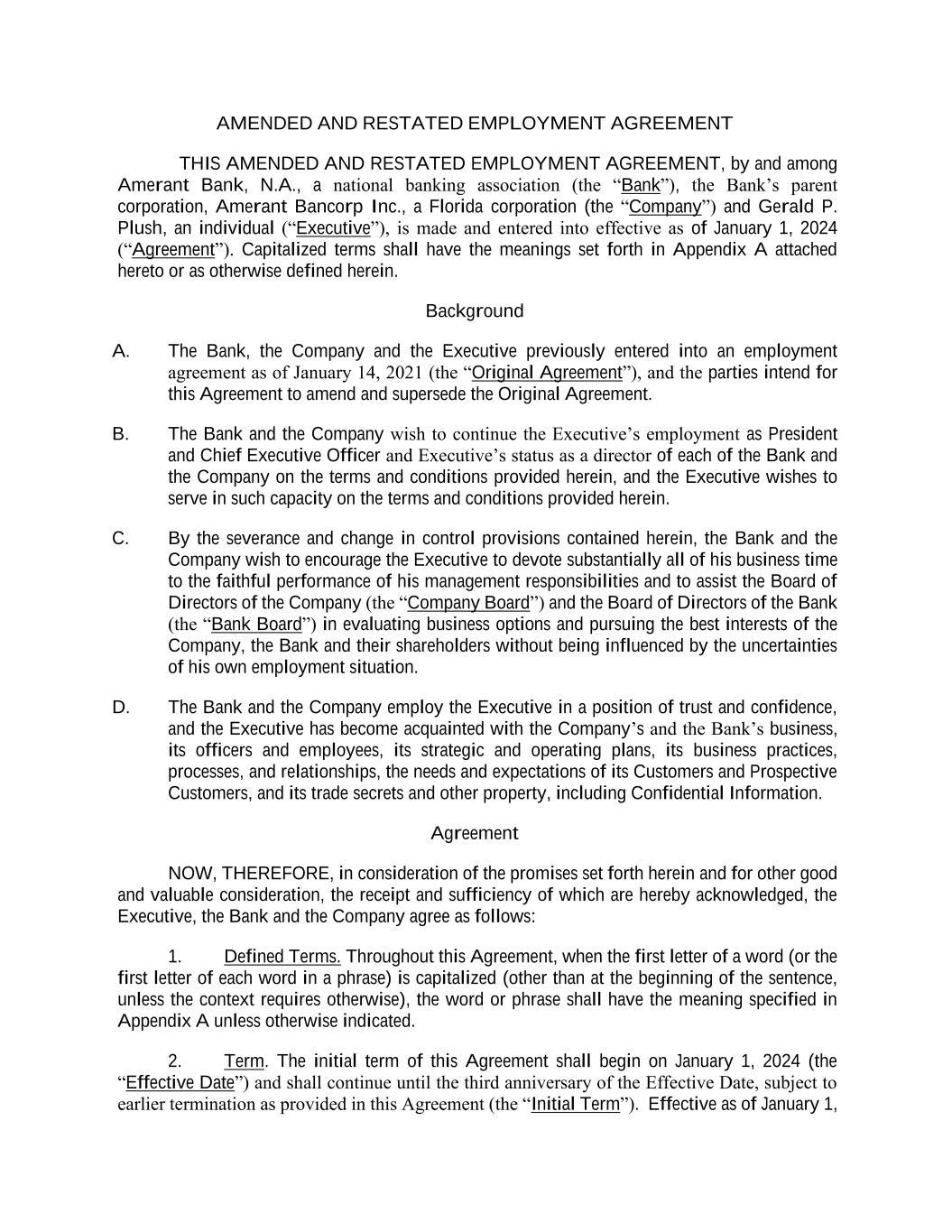 AMENDED AND RESTATED EMPLOYMENT AGREEMENT THIS AMENDED AND RESTATED EMPLOYMENT AGREEMENT, by and among Amerant Bank, N.A., a national banking association (the “Bank”), the Bank’s parent corporation, Amerant Bancorp Inc., a Florida corporation (the “Company”) and Gerald P. Plush, an individual (“Executive”), is made and entered into effective as of January 1, 2024 (“Agreement”). Capitalized terms shall have the meanings set forth in Appendix A attached hereto or as otherwise defined herein. Background A. The Bank, the Company and the Executive previously entered into an employment agreement as of January 14, 2021 (the “Original Agreement”), and the parties intend for this Agreement to amend and supersede the Original Agreement. B. The Bank and the Company wish to continue the Executive’s employment as President and Chief Executive Officer and Executive’s status as a director of each of the Bank and the Company on the terms and conditions provided herein, and the Executive wishes to serve in such capacity on the terms and conditions provided herein. C. By the severance and change in control provisions contained herein, the Bank and the Company wish to encourage the Executive to devote substantially all of his business time to the faithful performance of his management responsibilities and to assist the Board of Directors of the Company (the “Company Board”) and the Board of Directors of the Bank (the “Bank Board”) in evaluating business options and pursuing the best interests of the Company, the Bank and their shareholders without being influenced by the uncertainties of his own employment situation. D. The Bank and the Company employ the Executive in a position of trust and confidence, and the Executive has become acquainted with the Company’s and the Bank’s business, its officers and employees, its strategic and operating plans, its business practices, processes, and relationships, the needs and expectations of its Customers and Prospective Customers, and its trade secrets and other property, including Confidential Information. Agreement NOW, THEREFORE, in consideration of the promises set forth herein and for other good and valuable consideration, the receipt and sufficiency of which are hereby acknowledged, the Executive, the Bank and the Company agree as follows: 1. Defined Terms. Throughout this Agreement, when the first letter of a word (or the first letter of each word in a phrase) is capitalized (other than at the beginning of the sentence, unless the context requires otherwise), the word or phrase shall have the meaning specified in Appendix A unless otherwise indicated. 2. Term. The initial term of this Agreement shall begin on January 1, 2024 (the “Effective Date”) and shall continue until the third anniversary of the Effective Date, subject to earlier termination as provided in this Agreement (the “Initial Term”). Effective as of January 1,