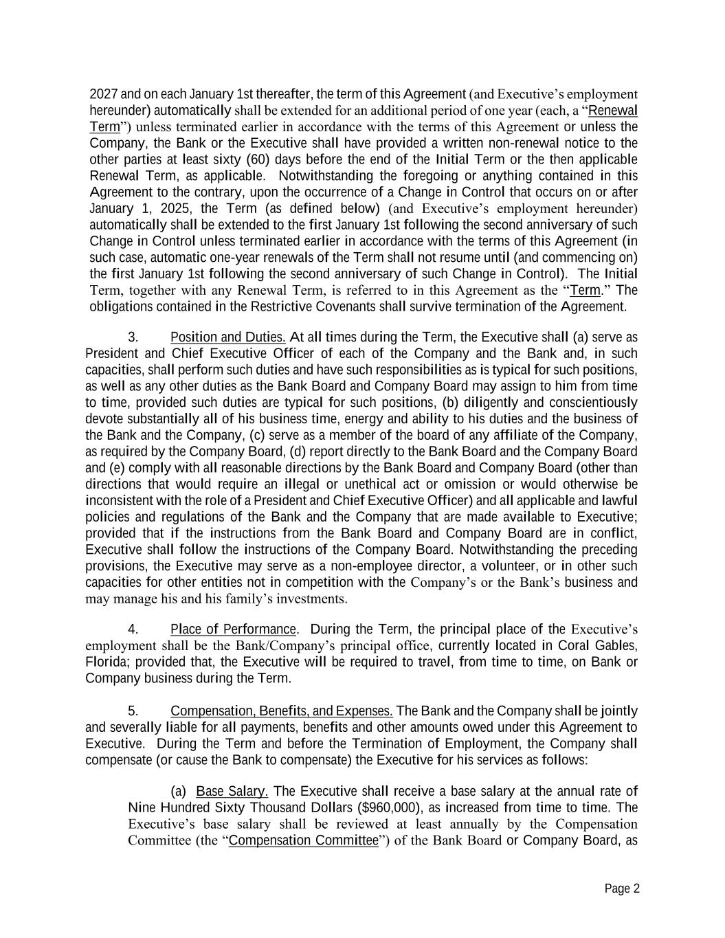 Page 2 2027 and on each January 1st thereafter, the term of this Agreement (and Executive’s employment hereunder) automatically shall be extended for an additional period of one year (each, a “Renewal Term”) unless terminated earlier in accordance with the terms of this Agreement or unless the Company, the Bank or the Executive shall have provided a written non-renewal notice to the other parties at least sixty (60) days before the end of the Initial Term or the then applicable Renewal Term, as applicable. Notwithstanding the foregoing or anything contained in this Agreement to the contrary, upon the occurrence of a Change in Control that occurs on or after January 1, 2025, the Term (as defined below) (and Executive’s employment hereunder) automatically shall be extended to the first January 1st following the second anniversary of such Change in Control unless terminated earlier in accordance with the terms of this Agreement (in such case, automatic one-year renewals of the Term shall not resume until (and commencing on) the first January 1st following the second anniversary of such Change in Control). The Initial Term, together with any Renewal Term, is referred to in this Agreement as the “Term.” The obligations contained in the Restrictive Covenants shall survive termination of the Agreement. 3. Position and Duties. At all times during the Term, the Executive shall (a) serve as President and Chief Executive Officer of each of the Company and the Bank and, in such capacities, shall perform such duties and have such responsibilities as is typical for such positions, as well as any other duties as the Bank Board and Company Board may assign to him from time to time, provided such duties are typical for such positions, (b) diligently and conscientiously devote substantially all of his business time, energy and ability to his duties and the business of the Bank and the Company, (c) serve as a member of the board of any affiliate of the Company, as required by the Company Board, (d) report directly to the Bank Board and the Company Board and (e) comply with all reasonable directions by the Bank Board and Company Board (other than directions that would require an illegal or unethical act or omission or would otherwise be inconsistent with the role of a President and Chief Executive Officer) and all applicable and lawful policies and regulations of the Bank and the Company that are made available to Executive; provided that if the instructions from the Bank Board and Company Board are in conflict, Executive shall follow the instructions of the Company Board. Notwithstanding the preceding provisions, the Executive may serve as a non-employee director, a volunteer, or in other such capacities for other entities not in competition with the Company’s or the Bank’s business and may manage his and his family’s investments. 4. Place of Performance. During the Term, the principal place of the Executive’s employment shall be the Bank/Company’s principal office, currently located in Coral Gables, Florida; provided that, the Executive will be required to travel, from time to time, on Bank or Company business during the Term. 5. Compensation, Benefits, and Expenses. The Bank and the Company shall be jointly and severally liable for all payments, benefits and other amounts owed under this Agreement to Executive. During the Term and before the Termination of Employment, the Company shall compensate (or cause the Bank to compensate) the Executive for his services as follows: (a) Base Salary. The Executive shall receive a base salary at the annual rate of Nine Hundred Sixty Thousand Dollars ($960,000), as increased from time to time. The Executive’s base salary shall be reviewed at least annually by the Compensation Committee (the “Compensation Committee”) of the Bank Board or Company Board, as