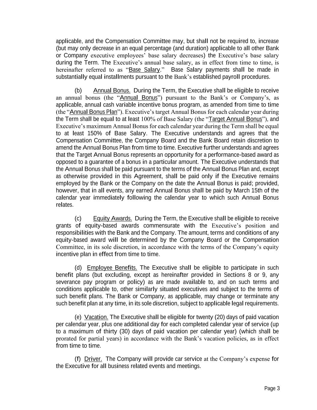 Page 3 applicable, and the Compensation Committee may, but shall not be required to, increase (but may only decrease in an equal percentage (and duration) applicable to all other Bank or Company executive employees’ base salary decreases) the Executive’s base salary during the Term. The Executive’s annual base salary, as in effect from time to time, is hereinafter referred to as “Base Salary.” Base Salary payments shall be made in substantially equal installments pursuant to the Bank’s established payroll procedures. (b) Annual Bonus. During the Term, the Executive shall be eligible to receive an annual bonus (the “Annual Bonus”) pursuant to the Bank’s or Company’s, as applicable, annual cash variable incentive bonus program, as amended from time to time (the “Annual Bonus Plan”). Executive’s target Annual Bonus for each calendar year during the Term shall be equal to at least 100% of Base Salary (the “Target Annual Bonus”), and Executive’s maximum Annual Bonus for each calendar year during the Term shall be equal to at least 150% of Base Salary. The Executive understands and agrees that the Compensation Committee, the Company Board and the Bank Board retain discretion to amend the Annual Bonus Plan from time to time. Executive further understands and agrees that the Target Annual Bonus represents an opportunity for a performance-based award as opposed to a guarantee of a bonus in a particular amount. The Executive understands that the Annual Bonus shall be paid pursuant to the terms of the Annual Bonus Plan and, except as otherwise provided in this Agreement, shall be paid only if the Executive remains employed by the Bank or the Company on the date the Annual Bonus is paid; provided, however, that in all events, any earned Annual Bonus shall be paid by March 15th of the calendar year immediately following the calendar year to which such Annual Bonus relates. (c) Equity Awards. During the Term, the Executive shall be eligible to receive grants of equity-based awards commensurate with the Executive’s position and responsibilities with the Bank and the Company. The amount, terms and conditions of any equity-based award will be determined by the Company Board or the Compensation Committee, in its sole discretion, in accordance with the terms of the Company’s equity incentive plan in effect from time to time. (d) Employee Benefits. The Executive shall be eligible to participate in such benefit plans (but excluding, except as hereinafter provided in Sections 8 or 9, any severance pay program or policy) as are made available to, and on such terms and conditions applicable to, other similarly situated executives and subject to the terms of such benefit plans. The Bank or Company, as applicable, may change or terminate any such benefit plan at any time, in its sole discretion, subject to applicable legal requirements. (e) Vacation. The Executive shall be eligible for twenty (20) days of paid vacation per calendar year, plus one additional day for each completed calendar year of service (up to a maximum of thirty (30) days of paid vacation per calendar year) (which shall be prorated for partial years) in accordance with the Bank’s vacation policies, as in effect from time to time. (f) Driver. The Company will provide car service at the Company’s expense for the Executive for all business related events and meetings.