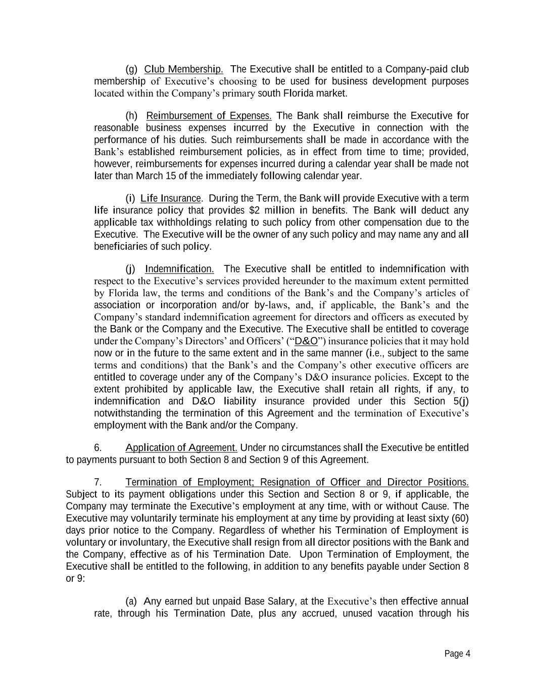 Page 4 (g) Club Membership. The Executive shall be entitled to a Company-paid club membership of Executive’s choosing to be used for business development purposes located within the Company’s primary south Florida market. (h) Reimbursement of Expenses. The Bank shall reimburse the Executive for reasonable business expenses incurred by the Executive in connection with the performance of his duties. Such reimbursements shall be made in accordance with the Bank’s established reimbursement policies, as in effect from time to time; provided, however, reimbursements for expenses incurred during a calendar year shall be made not later than March 15 of the immediately following calendar year. (i) Life Insurance. During the Term, the Bank will provide Executive with a term life insurance policy that provides $2 million in benefits. The Bank will deduct any applicable tax withholdings relating to such policy from other compensation due to the Executive. The Executive will be the owner of any such policy and may name any and all beneficiaries of such policy. (j) Indemnification. The Executive shall be entitled to indemnification with respect to the Executive’s services provided hereunder to the maximum extent permitted by Florida law, the terms and conditions of the Bank’s and the Company’s articles of association or incorporation and/or by-laws, and, if applicable, the Bank’s and the Company’s standard indemnification agreement for directors and officers as executed by the Bank or the Company and the Executive. The Executive shall be entitled to coverage under the Company’s Directors’ and Officers’ (“D&O”) insurance policies that it may hold now or in the future to the same extent and in the same manner (i.e., subject to the same terms and conditions) that the Bank’s and the Company’s other executive officers are entitled to coverage under any of the Company’s D&O insurance policies. Except to the extent prohibited by applicable law, the Executive shall retain all rights, if any, to indemnification and D&O liability insurance provided under this Section 5(j) notwithstanding the termination of this Agreement and the termination of Executive’s employment with the Bank and/or the Company. 6. Application of Agreement. Under no circumstances shall the Executive be entitled to payments pursuant to both Section 8 and Section 9 of this Agreement. 7. Termination of Employment; Resignation of Officer and Director Positions. Subject to its payment obligations under this Section and Section 8 or 9, if applicable, the Company may terminate the Executive’s employment at any time, with or without Cause. The Executive may voluntarily terminate his employment at any time by providing at least sixty (60) days prior notice to the Company. Regardless of whether his Termination of Employment is voluntary or involuntary, the Executive shall resign from all director positions with the Bank and the Company, effective as of his Termination Date. Upon Termination of Employment, the Executive shall be entitled to the following, in addition to any benefits payable under Section 8 or 9: (a) Any earned but unpaid Base Salary, at the Executive’s then effective annual rate, through his Termination Date, plus any accrued, unused vacation through his