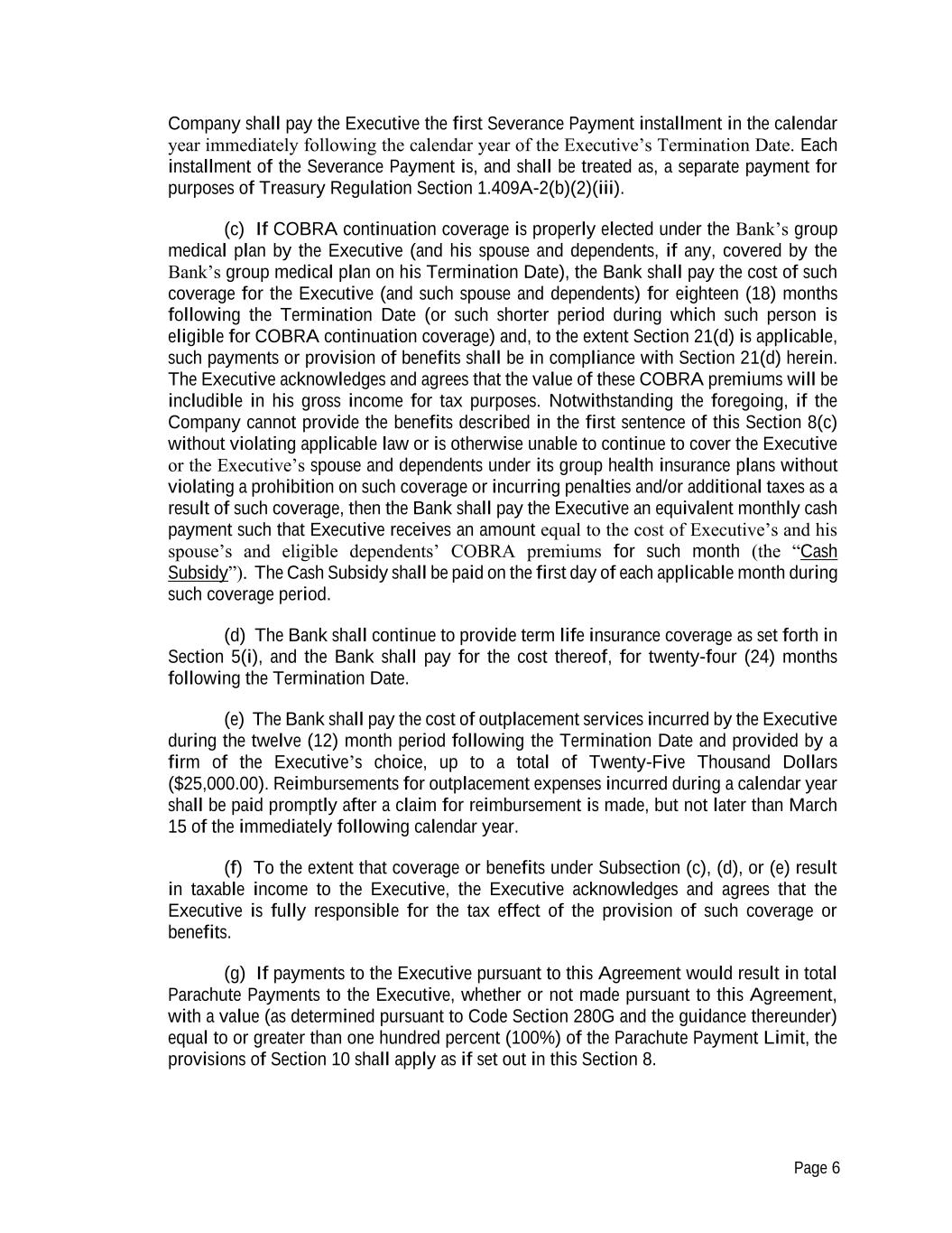 Page 6 Company shall pay the Executive the first Severance Payment installment in the calendar year immediately following the calendar year of the Executive’s Termination Date. Each installment of the Severance Payment is, and shall be treated as, a separate payment for purposes of Treasury Regulation Section 1.409A-2(b)(2)(iii). (c) If COBRA continuation coverage is properly elected under the Bank’s group medical plan by the Executive (and his spouse and dependents, if any, covered by the Bank’s group medical plan on his Termination Date), the Bank shall pay the cost of such coverage for the Executive (and such spouse and dependents) for eighteen (18) months following the Termination Date (or such shorter period during which such person is eligible for COBRA continuation coverage) and, to the extent Section 21(d) is applicable, such payments or provision of benefits shall be in compliance with Section 21(d) herein. The Executive acknowledges and agrees that the value of these COBRA premiums will be includible in his gross income for tax purposes. Notwithstanding the foregoing, if the Company cannot provide the benefits described in the first sentence of this Section 8(c) without violating applicable law or is otherwise unable to continue to cover the Executive or the Executive’s spouse and dependents under its group health insurance plans without violating a prohibition on such coverage or incurring penalties and/or additional taxes as a result of such coverage, then the Bank shall pay the Executive an equivalent monthly cash payment such that Executive receives an amount equal to the cost of Executive’s and his spouse’s and eligible dependents’ COBRA premiums for such month (the “Cash Subsidy”). The Cash Subsidy shall be paid on the first day of each applicable month during such coverage period. (d) The Bank shall continue to provide term life insurance coverage as set forth in Section 5(i), and the Bank shall pay for the cost thereof, for twenty-four (24) months following the Termination Date. (e) The Bank shall pay the cost of outplacement services incurred by the Executive during the twelve (12) month period following the Termination Date and provided by a firm of the Executive’s choice, up to a total of Twenty-Five Thousand Dollars ($25,000.00). Reimbursements for outplacement expenses incurred during a calendar year shall be paid promptly after a claim for reimbursement is made, but not later than March 15 of the immediately following calendar year. (f) To the extent that coverage or benefits under Subsection (c), (d), or (e) result in taxable income to the Executive, the Executive acknowledges and agrees that the Executive is fully responsible for the tax effect of the provision of such coverage or benefits. (g) If payments to the Executive pursuant to this Agreement would result in total Parachute Payments to the Executive, whether or not made pursuant to this Agreement, with a value (as determined pursuant to Code Section 280G and the guidance thereunder) equal to or greater than one hundred percent (100%) of the Parachute Payment Limit, the provisions of Section 10 shall apply as if set out in this Section 8.