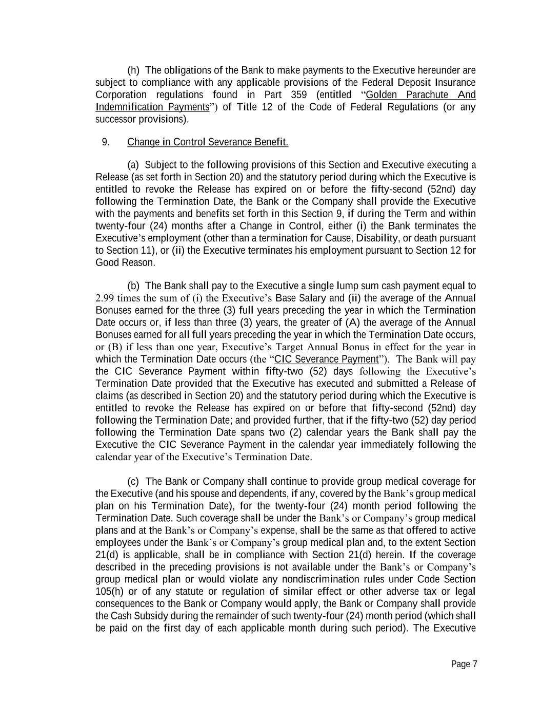 Page 7 (h) The obligations of the Bank to make payments to the Executive hereunder are subject to compliance with any applicable provisions of the Federal Deposit Insurance Corporation regulations found in Part 359 (entitled “Golden Parachute And Indemnification Payments”) of Title 12 of the Code of Federal Regulations (or any successor provisions). 9. Change in Control Severance Benefit. (a) Subject to the following provisions of this Section and Executive executing a Release (as set forth in Section 20) and the statutory period during which the Executive is entitled to revoke the Release has expired on or before the fifty-second (52nd) day following the Termination Date, the Bank or the Company shall provide the Executive with the payments and benefits set forth in this Section 9, if during the Term and within twenty-four (24) months after a Change in Control, either (i) the Bank terminates the Executive’s employment (other than a termination for Cause, Disability, or death pursuant to Section 11), or (ii) the Executive terminates his employment pursuant to Section 12 for Good Reason. (b) The Bank shall pay to the Executive a single lump sum cash payment equal to 2.99 times the sum of (i) the Executive’s Base Salary and (ii) the average of the Annual Bonuses earned for the three (3) full years preceding the year in which the Termination Date occurs or, if less than three (3) years, the greater of (A) the average of the Annual Bonuses earned for all full years preceding the year in which the Termination Date occurs, or (B) if less than one year, Executive’s Target Annual Bonus in effect for the year in which the Termination Date occurs (the “CIC Severance Payment”). The Bank will pay the CIC Severance Payment within fifty-two (52) days following the Executive’s Termination Date provided that the Executive has executed and submitted a Release of claims (as described in Section 20) and the statutory period during which the Executive is entitled to revoke the Release has expired on or before that fifty-second (52nd) day following the Termination Date; and provided further, that if the fifty-two (52) day period following the Termination Date spans two (2) calendar years the Bank shall pay the Executive the CIC Severance Payment in the calendar year immediately following the calendar year of the Executive’s Termination Date. (c) The Bank or Company shall continue to provide group medical coverage for the Executive (and his spouse and dependents, if any, covered by the Bank’s group medical plan on his Termination Date), for the twenty-four (24) month period following the Termination Date. Such coverage shall be under the Bank’s or Company’s group medical plans and at the Bank’s or Company’s expense, shall be the same as that offered to active employees under the Bank’s or Company’s group medical plan and, to the extent Section 21(d) is applicable, shall be in compliance with Section 21(d) herein. If the coverage described in the preceding provisions is not available under the Bank’s or Company’s group medical plan or would violate any nondiscrimination rules under Code Section 105(h) or of any statute or regulation of similar effect or other adverse tax or legal consequences to the Bank or Company would apply, the Bank or Company shall provide the Cash Subsidy during the remainder of such twenty-four (24) month period (which shall be paid on the first day of each applicable month during such period). The Executive