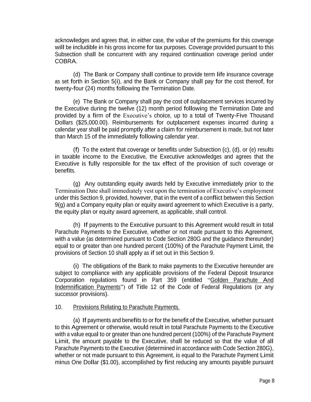 Page 8 acknowledges and agrees that, in either case, the value of the premiums for this coverage will be includible in his gross income for tax purposes. Coverage provided pursuant to this Subsection shall be concurrent with any required continuation coverage period under COBRA. (d) The Bank or Company shall continue to provide term life insurance coverage as set forth in Section 5(i), and the Bank or Company shall pay for the cost thereof, for twenty-four (24) months following the Termination Date. (e) The Bank or Company shall pay the cost of outplacement services incurred by the Executive during the twelve (12) month period following the Termination Date and provided by a firm of the Executive’s choice, up to a total of Twenty-Five Thousand Dollars ($25,000.00). Reimbursements for outplacement expenses incurred during a calendar year shall be paid promptly after a claim for reimbursement is made, but not later than March 15 of the immediately following calendar year. (f) To the extent that coverage or benefits under Subsection (c), (d), or (e) results in taxable income to the Executive, the Executive acknowledges and agrees that the Executive is fully responsible for the tax effect of the provision of such coverage or benefits. (g) Any outstanding equity awards held by Executive immediately prior to the Termination Date shall immediately vest upon the termination of Executive’s employment under this Section 9, provided, however, that in the event of a conflict between this Section 9(g) and a Company equity plan or equity award agreement to which Executive is a party, the equity plan or equity award agreement, as applicable, shall control. (h) If payments to the Executive pursuant to this Agreement would result in total Parachute Payments to the Executive, whether or not made pursuant to this Agreement, with a value (as determined pursuant to Code Section 280G and the guidance thereunder) equal to or greater than one hundred percent (100%) of the Parachute Payment Limit, the provisions of Section 10 shall apply as if set out in this Section 9. (i) The obligations of the Bank to make payments to the Executive hereunder are subject to compliance with any applicable provisions of the Federal Deposit Insurance Corporation regulations found in Part 359 (entitled “Golden Parachute And Indemnification Payments”) of Title 12 of the Code of Federal Regulations (or any successor provisions). 10. Provisions Relating to Parachute Payments. (a) If payments and benefits to or for the benefit of the Executive, whether pursuant to this Agreement or otherwise, would result in total Parachute Payments to the Executive with a value equal to or greater than one hundred percent (100%) of the Parachute Payment Limit, the amount payable to the Executive, shall be reduced so that the value of all Parachute Payments to the Executive (determined in accordance with Code Section 280G), whether or not made pursuant to this Agreement, is equal to the Parachute Payment Limit minus One Dollar ($1.00), accomplished by first reducing any amounts payable pursuant