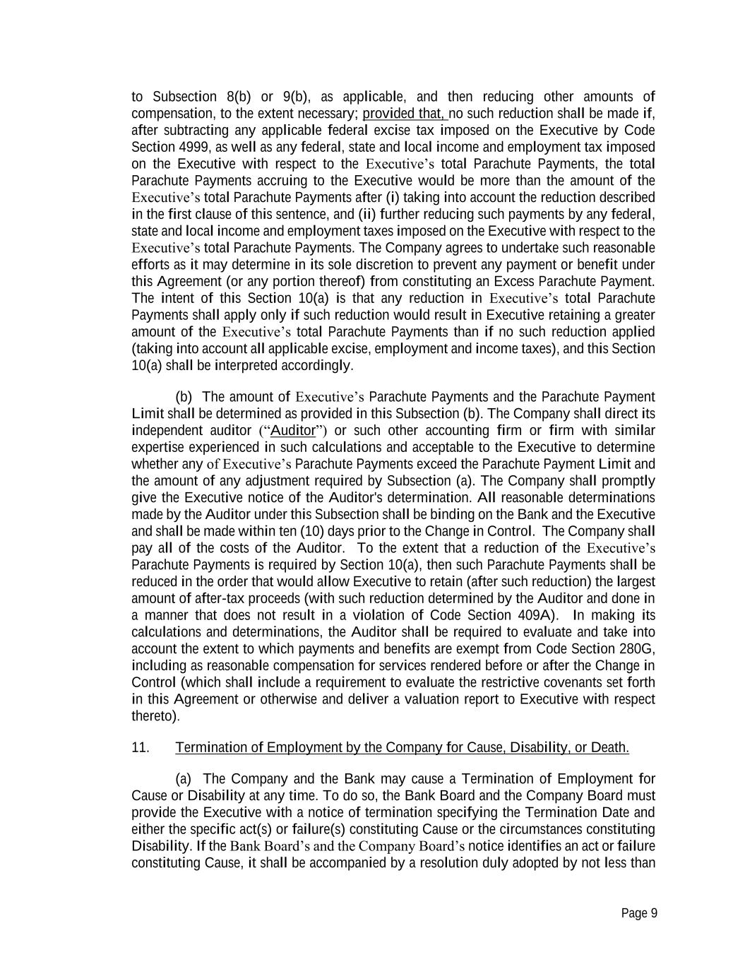 Page 9 to Subsection 8(b) or 9(b), as applicable, and then reducing other amounts of compensation, to the extent necessary; provided that, no such reduction shall be made if, after subtracting any applicable federal excise tax imposed on the Executive by Code Section 4999, as well as any federal, state and local income and employment tax imposed on the Executive with respect to the Executive’s total Parachute Payments, the total Parachute Payments accruing to the Executive would be more than the amount of the Executive’s total Parachute Payments after (i) taking into account the reduction described in the first clause of this sentence, and (ii) further reducing such payments by any federal, state and local income and employment taxes imposed on the Executive with respect to the Executive’s total Parachute Payments. The Company agrees to undertake such reasonable efforts as it may determine in its sole discretion to prevent any payment or benefit under this Agreement (or any portion thereof) from constituting an Excess Parachute Payment. The intent of this Section 10(a) is that any reduction in Executive’s total Parachute Payments shall apply only if such reduction would result in Executive retaining a greater amount of the Executive’s total Parachute Payments than if no such reduction applied (taking into account all applicable excise, employment and income taxes), and this Section 10(a) shall be interpreted accordingly. (b) The amount of Executive’s Parachute Payments and the Parachute Payment Limit shall be determined as provided in this Subsection (b). The Company shall direct its independent auditor (“Auditor”) or such other accounting firm or firm with similar expertise experienced in such calculations and acceptable to the Executive to determine whether any of Executive’s Parachute Payments exceed the Parachute Payment Limit and the amount of any adjustment required by Subsection (a). The Company shall promptly give the Executive notice of the Auditor's determination. All reasonable determinations made by the Auditor under this Subsection shall be binding on the Bank and the Executive and shall be made within ten (10) days prior to the Change in Control. The Company shall pay all of the costs of the Auditor. To the extent that a reduction of the Executive’s Parachute Payments is required by Section 10(a), then such Parachute Payments shall be reduced in the order that would allow Executive to retain (after such reduction) the largest amount of after-tax proceeds (with such reduction determined by the Auditor and done in a manner that does not result in a violation of Code Section 409A). In making its calculations and determinations, the Auditor shall be required to evaluate and take into account the extent to which payments and benefits are exempt from Code Section 280G, including as reasonable compensation for services rendered before or after the Change in Control (which shall include a requirement to evaluate the restrictive covenants set forth in this Agreement or otherwise and deliver a valuation report to Executive with respect thereto). 11. Termination of Employment by the Company for Cause, Disability, or Death. (a) The Company and the Bank may cause a Termination of Employment for Cause or Disability at any time. To do so, the Bank Board and the Company Board must provide the Executive with a notice of termination specifying the Termination Date and either the specific act(s) or failure(s) constituting Cause or the circumstances constituting Disability. If the Bank Board’s and the Company Board’s notice identifies an act or failure constituting Cause, it shall be accompanied by a resolution duly adopted by not less than