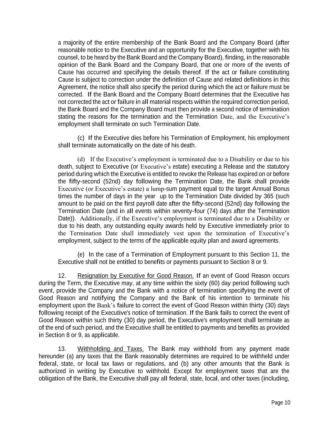 Page 10 a majority of the entire membership of the Bank Board and the Company Board (after reasonable notice to the Executive and an opportunity for the Executive, together with his counsel, to be heard by the Bank Board and the Company Board), finding, in the reasonable opinion of the Bank Board and the Company Board, that one or more of the events of Cause has occurred and specifying the details thereof. If the act or failure constituting Cause is subject to correction under the definition of Cause and related definitions in this Agreement, the notice shall also specify the period during which the act or failure must be corrected. If the Bank Board and the Company Board determines that the Executive has not corrected the act or failure in all material respects within the required correction period, the Bank Board and the Company Board must then provide a second notice of termination stating the reasons for the termination and the Termination Date, and the Executive’s employment shall terminate on such Termination Date. (c) If the Executive dies before his Termination of Employment, his employment shall terminate automatically on the date of his death. (d) If the Executive’s employment is terminated due to a Disability or due to his death, subject to Executive (or Executive’s estate) executing a Release and the statutory period during which the Executive is entitled to revoke the Release has expired on or before the fifty-second (52nd) day following the Termination Date, the Bank shall provide Executive (or Executive’s estate) a lump-sum payment equal to the target Annual Bonus times the number of days in the year up to the Termination Date divided by 365 (such amount to be paid on the first payroll date after the fifty-second (52nd) day following the Termination Date (and in all events within seventy-four (74) days after the Termination Date)). Additionally, if the Executive’s employment is terminated due to a Disability or due to his death, any outstanding equity awards held by Executive immediately prior to the Termination Date shall immediately vest upon the termination of Executive’s employment, subject to the terms of the applicable equity plan and award agreements. (e) In the case of a Termination of Employment pursuant to this Section 11, the Executive shall not be entitled to benefits or payments pursuant to Section 8 or 9. 12. Resignation by Executive for Good Reason. If an event of Good Reason occurs during the Term, the Executive may, at any time within the sixty (60) day period following such event, provide the Company and the Bank with a notice of termination specifying the event of Good Reason and notifying the Company and the Bank of his intention to terminate his employment upon the Bank’s failure to correct the event of Good Reason within thirty (30) days following receipt of the Executive's notice of termination. If the Bank fails to correct the event of Good Reason within such thirty (30) day period, the Executive's employment shall terminate as of the end of such period, and the Executive shall be entitled to payments and benefits as provided in Section 8 or 9, as applicable. 13. Withholding and Taxes. The Bank may withhold from any payment made hereunder (a) any taxes that the Bank reasonably determines are required to be withheld under federal, state, or local tax laws or regulations, and (b) any other amounts that the Bank is authorized in writing by Executive to withhold. Except for employment taxes that are the obligation of the Bank, the Executive shall pay all federal, state, local, and other taxes (including,