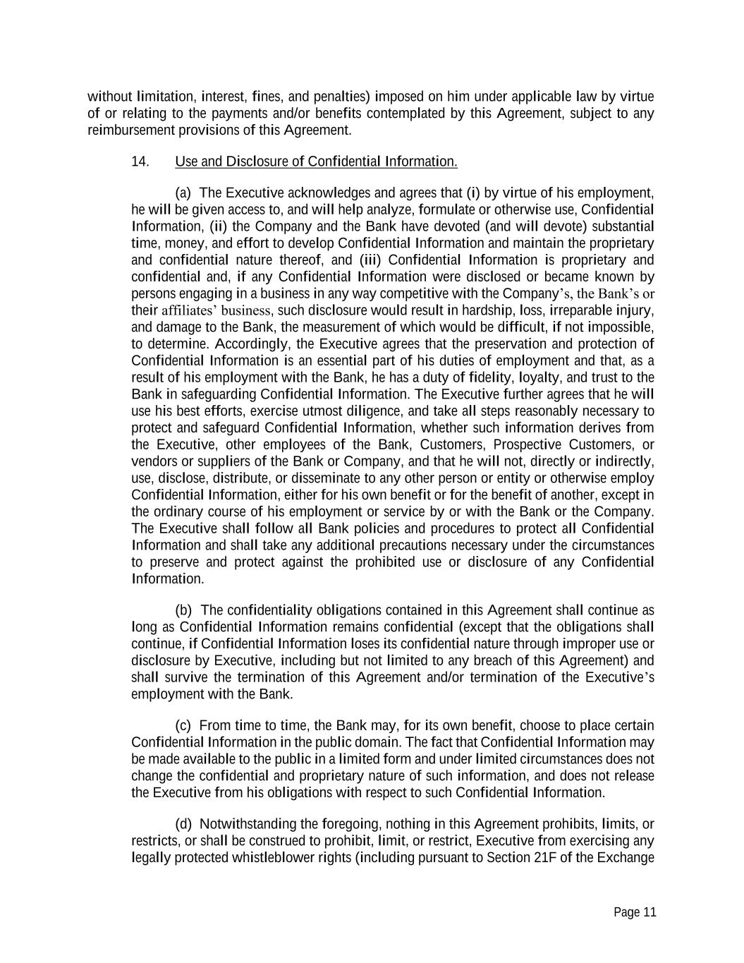 Page 11 without limitation, interest, fines, and penalties) imposed on him under applicable law by virtue of or relating to the payments and/or benefits contemplated by this Agreement, subject to any reimbursement provisions of this Agreement. 14. Use and Disclosure of Confidential Information. (a) The Executive acknowledges and agrees that (i) by virtue of his employment, he will be given access to, and will help analyze, formulate or otherwise use, Confidential Information, (ii) the Company and the Bank have devoted (and will devote) substantial time, money, and effort to develop Confidential Information and maintain the proprietary and confidential nature thereof, and (iii) Confidential Information is proprietary and confidential and, if any Confidential Information were disclosed or became known by persons engaging in a business in any way competitive with the Company’s, the Bank’s or their affiliates’ business, such disclosure would result in hardship, loss, irreparable injury, and damage to the Bank, the measurement of which would be difficult, if not impossible, to determine. Accordingly, the Executive agrees that the preservation and protection of Confidential Information is an essential part of his duties of employment and that, as a result of his employment with the Bank, he has a duty of fidelity, loyalty, and trust to the Bank in safeguarding Confidential Information. The Executive further agrees that he will use his best efforts, exercise utmost diligence, and take all steps reasonably necessary to protect and safeguard Confidential Information, whether such information derives from the Executive, other employees of the Bank, Customers, Prospective Customers, or vendors or suppliers of the Bank or Company, and that he will not, directly or indirectly, use, disclose, distribute, or disseminate to any other person or entity or otherwise employ Confidential Information, either for his own benefit or for the benefit of another, except in the ordinary course of his employment or service by or with the Bank or the Company. The Executive shall follow all Bank policies and procedures to protect all Confidential Information and shall take any additional precautions necessary under the circumstances to preserve and protect against the prohibited use or disclosure of any Confidential Information. (b) The confidentiality obligations contained in this Agreement shall continue as long as Confidential Information remains confidential (except that the obligations shall continue, if Confidential Information loses its confidential nature through improper use or disclosure by Executive, including but not limited to any breach of this Agreement) and shall survive the termination of this Agreement and/or termination of the Executive’s employment with the Bank. (c) From time to time, the Bank may, for its own benefit, choose to place certain Confidential Information in the public domain. The fact that Confidential Information may be made available to the public in a limited form and under limited circumstances does not change the confidential and proprietary nature of such information, and does not release the Executive from his obligations with respect to such Confidential Information. (d) Notwithstanding the foregoing, nothing in this Agreement prohibits, limits, or restricts, or shall be construed to prohibit, limit, or restrict, Executive from exercising any legally protected whistleblower rights (including pursuant to Section 21F of the Exchange