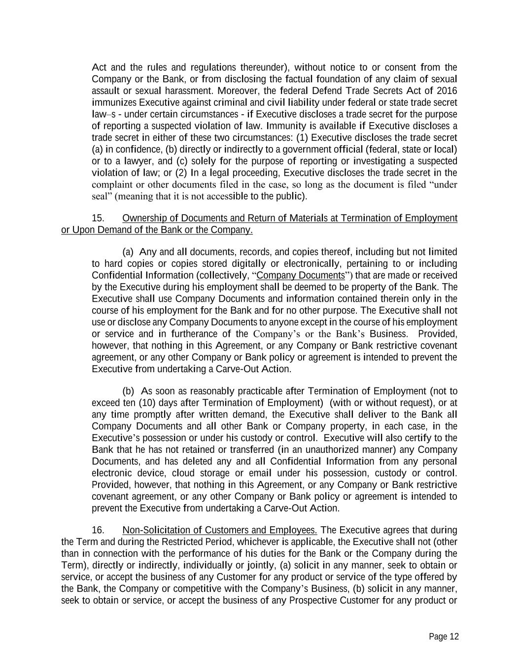 Page 12 Act and the rules and regulations thereunder), without notice to or consent from the Company or the Bank, or from disclosing the factual foundation of any claim of sexual assault or sexual harassment. Moreover, the federal Defend Trade Secrets Act of 2016 immunizes Executive against criminal and civil liability under federal or state trade secret law–s - under certain circumstances - if Executive discloses a trade secret for the purpose of reporting a suspected violation of law. Immunity is available if Executive discloses a trade secret in either of these two circumstances: (1) Executive discloses the trade secret (a) in confidence, (b) directly or indirectly to a government official (federal, state or local) or to a lawyer, and (c) solely for the purpose of reporting or investigating a suspected violation of law; or (2) In a legal proceeding, Executive discloses the trade secret in the complaint or other documents filed in the case, so long as the document is filed “under seal” (meaning that it is not accessible to the public). 15. Ownership of Documents and Return of Materials at Termination of Employment or Upon Demand of the Bank or the Company. (a) Any and all documents, records, and copies thereof, including but not limited to hard copies or copies stored digitally or electronically, pertaining to or including Confidential Information (collectively, “Company Documents”) that are made or received by the Executive during his employment shall be deemed to be property of the Bank. The Executive shall use Company Documents and information contained therein only in the course of his employment for the Bank and for no other purpose. The Executive shall not use or disclose any Company Documents to anyone except in the course of his employment or service and in furtherance of the Company’s or the Bank’s Business. Provided, however, that nothing in this Agreement, or any Company or Bank restrictive covenant agreement, or any other Company or Bank policy or agreement is intended to prevent the Executive from undertaking a Carve-Out Action. (b) As soon as reasonably practicable after Termination of Employment (not to exceed ten (10) days after Termination of Employment) (with or without request), or at any time promptly after written demand, the Executive shall deliver to the Bank all Company Documents and all other Bank or Company property, in each case, in the Executive’s possession or under his custody or control. Executive will also certify to the Bank that he has not retained or transferred (in an unauthorized manner) any Company Documents, and has deleted any and all Confidential Information from any personal electronic device, cloud storage or email under his possession, custody or control. Provided, however, that nothing in this Agreement, or any Company or Bank restrictive covenant agreement, or any other Company or Bank policy or agreement is intended to prevent the Executive from undertaking a Carve-Out Action. 16. Non-Solicitation of Customers and Employees. The Executive agrees that during the Term and during the Restricted Period, whichever is applicable, the Executive shall not (other than in connection with the performance of his duties for the Bank or the Company during the Term), directly or indirectly, individually or jointly, (a) solicit in any manner, seek to obtain or service, or accept the business of any Customer for any product or service of the type offered by the Bank, the Company or competitive with the Company’s Business, (b) solicit in any manner, seek to obtain or service, or accept the business of any Prospective Customer for any product or