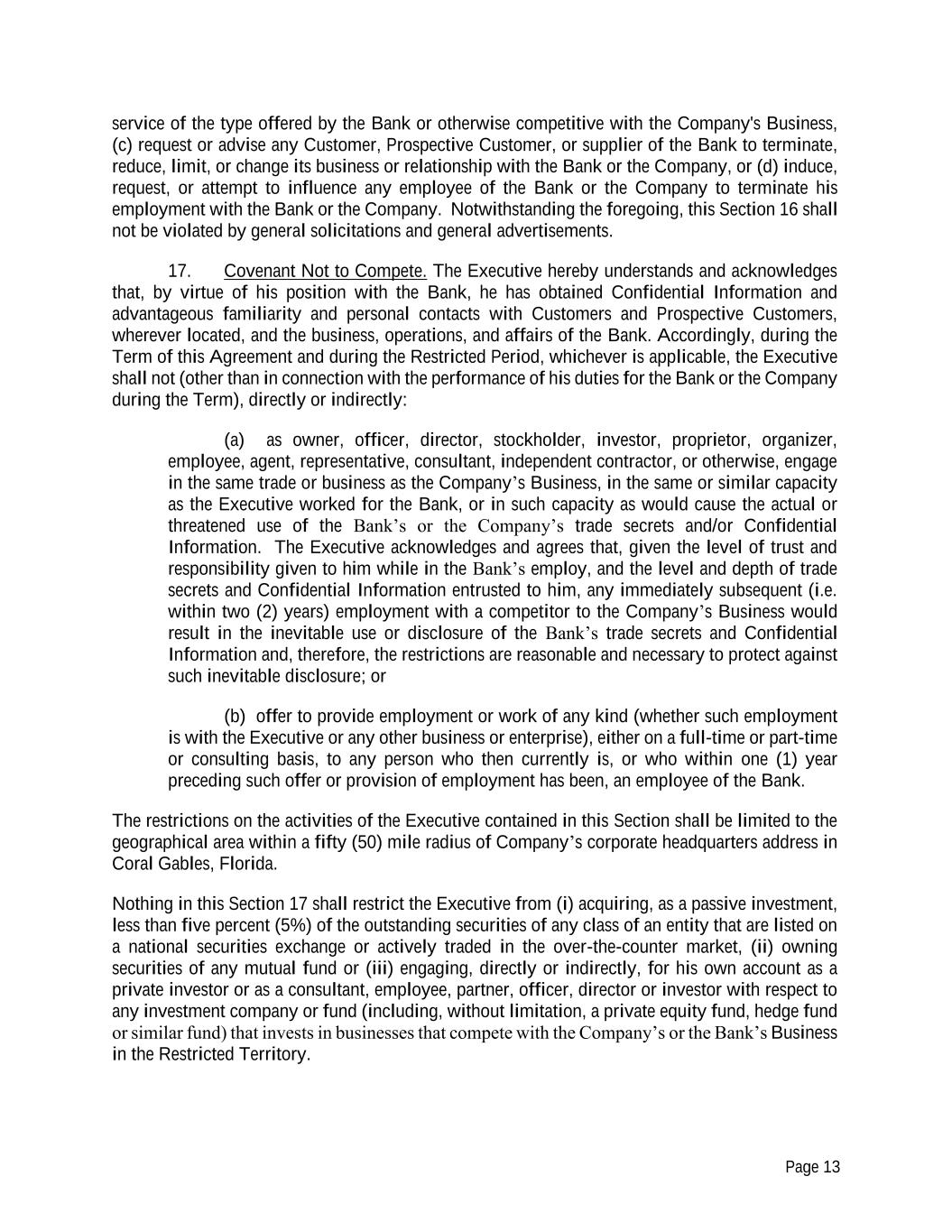 Page 13 service of the type offered by the Bank or otherwise competitive with the Company's Business, (c) request or advise any Customer, Prospective Customer, or supplier of the Bank to terminate, reduce, limit, or change its business or relationship with the Bank or the Company, or (d) induce, request, or attempt to influence any employee of the Bank or the Company to terminate his employment with the Bank or the Company. Notwithstanding the foregoing, this Section 16 shall not be violated by general solicitations and general advertisements. 17. Covenant Not to Compete. The Executive hereby understands and acknowledges that, by virtue of his position with the Bank, he has obtained Confidential Information and advantageous familiarity and personal contacts with Customers and Prospective Customers, wherever located, and the business, operations, and affairs of the Bank. Accordingly, during the Term of this Agreement and during the Restricted Period, whichever is applicable, the Executive shall not (other than in connection with the performance of his duties for the Bank or the Company during the Term), directly or indirectly: (a) as owner, officer, director, stockholder, investor, proprietor, organizer, employee, agent, representative, consultant, independent contractor, or otherwise, engage in the same trade or business as the Company’s Business, in the same or similar capacity as the Executive worked for the Bank, or in such capacity as would cause the actual or threatened use of the Bank’s or the Company’s trade secrets and/or Confidential Information. The Executive acknowledges and agrees that, given the level of trust and responsibility given to him while in the Bank’s employ, and the level and depth of trade secrets and Confidential Information entrusted to him, any immediately subsequent (i.e. within two (2) years) employment with a competitor to the Company’s Business would result in the inevitable use or disclosure of the Bank’s trade secrets and Confidential Information and, therefore, the restrictions are reasonable and necessary to protect against such inevitable disclosure; or (b) offer to provide employment or work of any kind (whether such employment is with the Executive or any other business or enterprise), either on a full-time or part-time or consulting basis, to any person who then currently is, or who within one (1) year preceding such offer or provision of employment has been, an employee of the Bank. The restrictions on the activities of the Executive contained in this Section shall be limited to the geographical area within a fifty (50) mile radius of Company’s corporate headquarters address in Coral Gables, Florida. Nothing in this Section 17 shall restrict the Executive from (i) acquiring, as a passive investment, less than five percent (5%) of the outstanding securities of any class of an entity that are listed on a national securities exchange or actively traded in the over-the-counter market, (ii) owning securities of any mutual fund or (iii) engaging, directly or indirectly, for his own account as a private investor or as a consultant, employee, partner, officer, director or investor with respect to any investment company or fund (including, without limitation, a private equity fund, hedge fund or similar fund) that invests in businesses that compete with the Company’s or the Bank’s Business in the Restricted Territory.