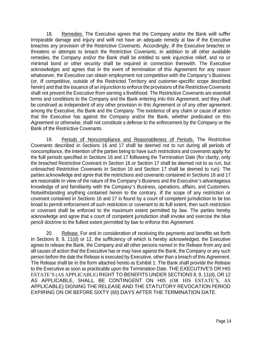 Page 14 18. Remedies. The Executive agrees that the Company and/or the Bank will suffer irreparable damage and injury and will not have an adequate remedy at law if the Executive breaches any provision of the Restrictive Covenants. Accordingly, if the Executive breaches or threatens or attempts to breach the Restrictive Covenants, in addition to all other available remedies, the Company and/or the Bank shall be entitled to seek injunctive relief, and no or minimal bond or other security shall be required in connection therewith. The Executive acknowledges and agrees that in the event of termination of this Agreement for any reason whatsoever, the Executive can obtain employment not competitive with the Company’s Business (or, if competitive, outside of the Restricted Territory and customer-specific scope described herein) and that the issuance of an injunction to enforce the provisions of the Restrictive Covenants shall not prevent the Executive from earning a livelihood. The Restrictive Covenants are essential terms and conditions to the Company and the Bank entering into this Agreement, and they shall be construed as independent of any other provision in this Agreement or of any other agreement among the Executive, the Bank and the Company. The existence of any claim or cause of action that the Executive has against the Company and/or the Bank, whether predicated on this Agreement or otherwise, shall not constitute a defense to the enforcement by the Company or the Bank of the Restrictive Covenants. 19. Periods of Noncompliance and Reasonableness of Periods. The Restrictive Covenants described in Sections 16 and 17 shall be deemed not to run during all periods of noncompliance, the intention of the parties being to have such restrictions and covenants apply for the full periods specified in Sections 16 and 17 following the Termination Date (for clarity, only the breached Restrictive Covenant in Section 16 or Section 17 shall be deemed not to so run, but unbreached Restrictive Covenants in Section 16 and Section 17 shall be deemed to run). The parties acknowledge and agree that the restrictions and covenants contained in Sections 16 and 17 are reasonable in view of the nature of the Company’s Business and the Executive’s advantageous knowledge of and familiarity with the Company’s Business, operations, affairs, and Customers. Notwithstanding anything contained herein to the contrary, if the scope of any restriction or covenant contained in Sections 16 and 17 is found by a court of competent jurisdiction to be too broad to permit enforcement of such restriction or covenant to its full extent, then such restriction or covenant shall be enforced to the maximum extent permitted by law. The parties hereby acknowledge and agree that a court of competent jurisdiction shall invoke and exercise the blue pencil doctrine to the fullest extent permitted by law to enforce this Agreement. 20. Release. For and in consideration of receiving the payments and benefits set forth in Sections 8, 9, 11(d) or 12, the sufficiency of which is hereby acknowledged, the Executive agrees to release the Bank, the Company and all other persons named in the Release from any and all causes of action that the Executive has or may have against the Bank, the Company or any such person before the date the Release is executed by Executive, other than a breach of this Agreement. The Release shall be in the form attached hereto as Exhibit 1. The Bank shall provide the Release to the Executive as soon as practicable upon the Termination Date. THE EXECUTIVE'S OR HIS ESTATE’S (AS APPLICABLE) RIGHT TO BENEFITS UNDER SECTIONS 8, 9, 11(d), OR 12 AS APPLICABLE, SHALL BE CONTINGENT ON HIS (OR HIS ESTATE’S, AS APPLICABLE) SIGNING THE RELEASE AND THE STATUTORY REVOCATION PERIOD EXPIRING ON OR BEFORE SIXTY (60) DAYS AFTER THE TERMINATION DATE.