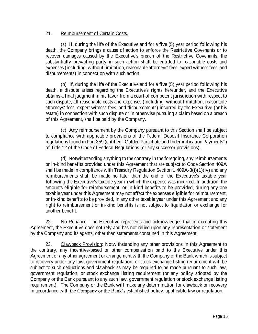 Page 15 21. Reimbursement of Certain Costs. (a) If, during the life of the Executive and for a five (5) year period following his death, the Company brings a cause of action to enforce the Restrictive Covenants or to recover damages caused by the Executive's breach of the Restrictive Covenants, the substantially prevailing party in such action shall be entitled to reasonable costs and expenses (including, without limitation, reasonable attorneys' fees, expert witness fees, and disbursements) in connection with such action. (b) If, during the life of the Executive and for a five (5) year period following his death, a dispute arises regarding the Executive's rights hereunder, and the Executive obtains a final judgment in his favor from a court of competent jurisdiction with respect to such dispute, all reasonable costs and expenses (including, without limitation, reasonable attorneys' fees, expert witness fees, and disbursements) incurred by the Executive (or his estate) in connection with such dispute or in otherwise pursuing a claim based on a breach of this Agreement, shall be paid by the Company. (c) Any reimbursement by the Company pursuant to this Section shall be subject to compliance with applicable provisions of the Federal Deposit Insurance Corporation regulations found in Part 359 (entitled “Golden Parachute and Indemnification Payments”) of Title 12 of the Code of Federal Regulations (or any successor provisions). (d) Notwithstanding anything to the contrary in the foregoing, any reimbursements or in-kind benefits provided under this Agreement that are subject to Code Section 409A shall be made in compliance with Treasury Regulation Section 1.409A-3(i)(1)(iv) and any reimbursements shall be made no later than the end of the Executive's taxable year following the Executive's taxable year in which the expense was incurred. In addition, the amounts eligible for reimbursement, or in-kind benefits to be provided, during any one taxable year under this Agreement may not affect the expenses eligible for reimbursement, or in-kind benefits to be provided, in any other taxable year under this Agreement and any right to reimbursement or in-kind benefits is not subject to liquidation or exchange for another benefit. 22. No Reliance. The Executive represents and acknowledges that in executing this Agreement, the Executive does not rely and has not relied upon any representation or statement by the Company and its agents, other than statements contained in this Agreement. 23. Clawback Provision: Notwithstanding any other provisions in this Agreement to the contrary, any incentive-based or other compensation paid to the Executive under this Agreement or any other agreement or arrangement with the Company or the Bank which is subject to recovery under any law, government regulation, or stock exchange listing requirement will be subject to such deductions and clawback as may be required to be made pursuant to such law, government regulation, or stock exchange listing requirement (or any policy adopted by the Company or the Bank pursuant to any such law, government regulation or stock exchange listing requirement). The Company or the Bank will make any determination for clawback or recovery in accordance with the Company or the Bank’s established policy, applicable law or regulation.