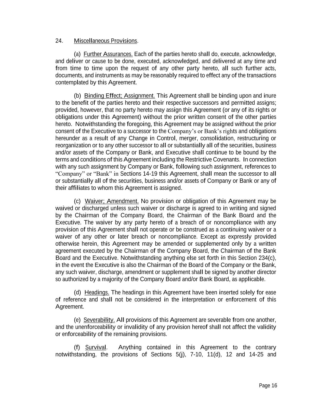Page 16 24. Miscellaneous Provisions. (a) Further Assurances. Each of the parties hereto shall do, execute, acknowledge, and deliver or cause to be done, executed, acknowledged, and delivered at any time and from time to time upon the request of any other party hereto, all such further acts, documents, and instruments as may be reasonably required to effect any of the transactions contemplated by this Agreement. (b) Binding Effect; Assignment. This Agreement shall be binding upon and inure to the benefit of the parties hereto and their respective successors and permitted assigns; provided, however, that no party hereto may assign this Agreement (or any of its rights or obligations under this Agreement) without the prior written consent of the other parties hereto. Notwithstanding the foregoing, this Agreement may be assigned without the prior consent of the Executive to a successor to the Company’s or Bank’s rights and obligations hereunder as a result of any Change in Control, merger, consolidation, restructuring or reorganization or to any other successor to all or substantially all of the securities, business and/or assets of the Company or Bank, and Executive shall continue to be bound by the terms and conditions of this Agreement including the Restrictive Covenants. In connection with any such assignment by Company or Bank, following such assignment, references to “Company” or “Bank” in Sections 14-19 this Agreement, shall mean the successor to all or substantially all of the securities, business and/or assets of Company or Bank or any of their affiliates to whom this Agreement is assigned. (c) Waiver; Amendment. No provision or obligation of this Agreement may be waived or discharged unless such waiver or discharge is agreed to in writing and signed by the Chairman of the Company Board, the Chairman of the Bank Board and the Executive. The waiver by any party hereto of a breach of or noncompliance with any provision of this Agreement shall not operate or be construed as a continuing waiver or a waiver of any other or later breach or noncompliance. Except as expressly provided otherwise herein, this Agreement may be amended or supplemented only by a written agreement executed by the Chairman of the Company Board, the Chairman of the Bank Board and the Executive. Notwithstanding anything else set forth in this Section 234(c), in the event the Executive is also the Chairman of the Board of the Company or the Bank, any such waiver, discharge, amendment or supplement shall be signed by another director so authorized by a majority of the Company Board and/or Bank Board, as applicable. (d) Headings. The headings in this Agreement have been inserted solely for ease of reference and shall not be considered in the interpretation or enforcement of this Agreement. (e) Severability. All provisions of this Agreement are severable from one another, and the unenforceability or invalidity of any provision hereof shall not affect the validity or enforceability of the remaining provisions. (f) Survival. Anything contained in this Agreement to the contrary notwithstanding, the provisions of Sections 5(j), 7-10, 11(d), 12 and 14-25 and