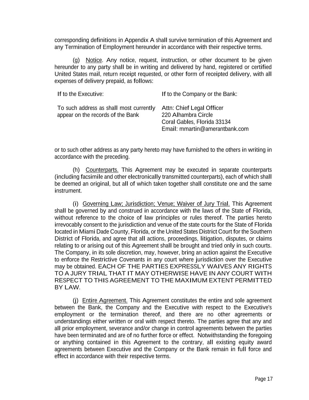 Page 17 corresponding definitions in Appendix A shall survive termination of this Agreement and any Termination of Employment hereunder in accordance with their respective terms. (g) Notice. Any notice, request, instruction, or other document to be given hereunder to any party shall be in writing and delivered by hand, registered or certified United States mail, return receipt requested, or other form of receipted delivery, with all expenses of delivery prepaid, as follows: If to the Executive: To such address as shall most currently appear on the records of the Bank If to the Company or the Bank: Attn: Chief Legal Officer 220 Alhambra Circle Coral Gables, Florida 33134 Email: mmartin@amerantbank.com or to such other address as any party hereto may have furnished to the others in writing in accordance with the preceding. (h) Counterparts. This Agreement may be executed in separate counterparts (including facsimile and other electronically transmitted counterparts), each of which shall be deemed an original, but all of which taken together shall constitute one and the same instrument. (i) Governing Law; Jurisdiction; Venue; Waiver of Jury Trial. This Agreement shall be governed by and construed in accordance with the laws of the State of Florida, without reference to the choice of law principles or rules thereof. The parties hereto irrevocably consent to the jurisdiction and venue of the state courts for the State of Florida located in Miami Dade County, Florida, or the United States District Court for the Southern District of Florida, and agree that all actions, proceedings, litigation, disputes, or claims relating to or arising out of this Agreement shall be brought and tried only in such courts. The Company, in its sole discretion, may, however, bring an action against the Executive to enforce the Restrictive Covenants in any court where jurisdiction over the Executive may be obtained. EACH OF THE PARTIES EXPRESSLY WAIVES ANY RIGHTS TO A JURY TRIAL THAT IT MAY OTHERWISE HAVE IN ANY COURT WITH RESPECT TO THIS AGREEMENT TO THE MAXIMUM EXTENT PERMITTED BY LAW. (j) Entire Agreement. This Agreement constitutes the entire and sole agreement between the Bank, the Company and the Executive with respect to the Executive's employment or the termination thereof, and there are no other agreements or understandings either written or oral with respect thereto. The parties agree that any and all prior employment, severance and/or change in control agreements between the parties have been terminated and are of no further force or effect. Notwithstanding the foregoing or anything contained in this Agreement to the contrary, all existing equity award agreements between Executive and the Company or the Bank remain in full force and effect in accordance with their respective terms.