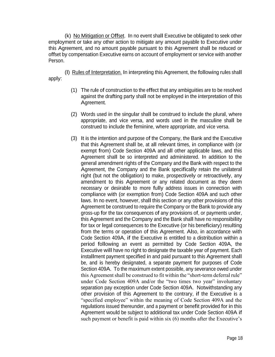 Page 18 (k) No Mitigation or Offset. In no event shall Executive be obligated to seek other employment or take any other action to mitigate any amount payable to Executive under this Agreement, and no amount payable pursuant to this Agreement shall be reduced or offset by compensation Executive earns on account of employment or service with another Person. (l) Rules of Interpretation. In interpreting this Agreement, the following rules shall apply: (1) The rule of construction to the effect that any ambiguities are to be resolved against the drafting party shall not be employed in the interpretation of this Agreement. (2) Words used in the singular shall be construed to include the plural, where appropriate, and vice versa, and words used in the masculine shall be construed to include the feminine, where appropriate, and vice versa. (3) It is the intention and purpose of the Company, the Bank and the Executive that this Agreement shall be, at all relevant times, in compliance with (or exempt from) Code Section 409A and all other applicable laws, and this Agreement shall be so interpreted and administered. In addition to the general amendment rights of the Company and the Bank with respect to the Agreement, the Company and the Bank specifically retain the unilateral right (but not the obligation) to make, prospectively or retroactively, any amendment to this Agreement or any related document as they deem necessary or desirable to more fully address issues in connection with compliance with (or exemption from) Code Section 409A and such other laws. In no event, however, shall this section or any other provisions of this Agreement be construed to require the Company or the Bank to provide any gross-up for the tax consequences of any provisions of, or payments under, this Agreement and the Company and the Bank shall have no responsibility for tax or legal consequences to the Executive (or his beneficiary) resulting from the terms or operation of this Agreement. Also, in accordance with Code Section 409A, if the Executive is entitled to a distribution within a period following an event as permitted by Code Section 409A, the Executive will have no right to designate the taxable year of payment. Each installment payment specified in and paid pursuant to this Agreement shall be, and is hereby designated, a separate payment for purposes of Code Section 409A. To the maximum extent possible, any severance owed under this Agreement shall be construed to fit within the “short-term deferral rule” under Code Section 409A and/or the “two times two year” involuntary separation pay exception under Code Section 409A. Notwithstanding any other provision of this Agreement to the contrary, if the Executive is a “specified employee” within the meaning of Code Section 409A and the regulations issued thereunder, and a payment or benefit provided for in this Agreement would be subject to additional tax under Code Section 409A if such payment or benefit is paid within six (6) months after the Executive’s