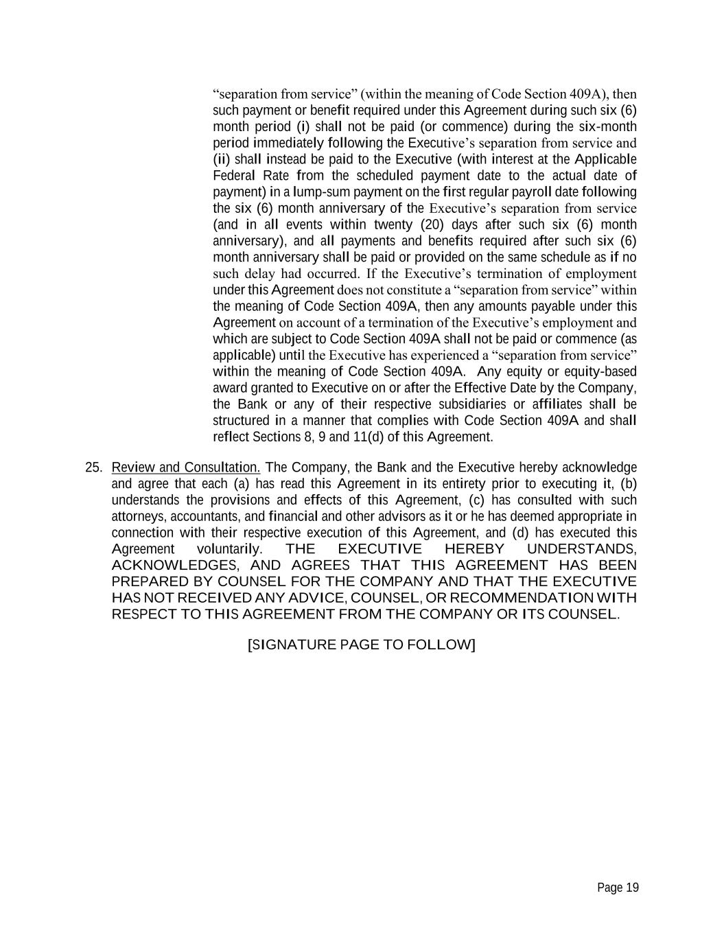 Page 19 “separation from service” (within the meaning of Code Section 409A), then such payment or benefit required under this Agreement during such six (6) month period (i) shall not be paid (or commence) during the six-month period immediately following the Executive’s separation from service and (ii) shall instead be paid to the Executive (with interest at the Applicable Federal Rate from the scheduled payment date to the actual date of payment) in a lump-sum payment on the first regular payroll date following the six (6) month anniversary of the Executive’s separation from service (and in all events within twenty (20) days after such six (6) month anniversary), and all payments and benefits required after such six (6) month anniversary shall be paid or provided on the same schedule as if no such delay had occurred. If the Executive’s termination of employment under this Agreement does not constitute a “separation from service” within the meaning of Code Section 409A, then any amounts payable under this Agreement on account of a termination of the Executive’s employment and which are subject to Code Section 409A shall not be paid or commence (as applicable) until the Executive has experienced a “separation from service” within the meaning of Code Section 409A. Any equity or equity-based award granted to Executive on or after the Effective Date by the Company, the Bank or any of their respective subsidiaries or affiliates shall be structured in a manner that complies with Code Section 409A and shall reflect Sections 8, 9 and 11(d) of this Agreement. 25. Review and Consultation. The Company, the Bank and the Executive hereby acknowledge and agree that each (a) has read this Agreement in its entirety prior to executing it, (b) understands the provisions and effects of this Agreement, (c) has consulted with such attorneys, accountants, and financial and other advisors as it or he has deemed appropriate in connection with their respective execution of this Agreement, and (d) has executed this Agreement voluntarily. THE EXECUTIVE HEREBY UNDERSTANDS, ACKNOWLEDGES, AND AGREES THAT THIS AGREEMENT HAS BEEN PREPARED BY COUNSEL FOR THE COMPANY AND THAT THE EXECUTIVE HAS NOT RECEIVED ANY ADVICE, COUNSEL, OR RECOMMENDATION WITH RESPECT TO THIS AGREEMENT FROM THE COMPANY OR ITS COUNSEL. [SIGNATURE PAGE TO FOLLOW]