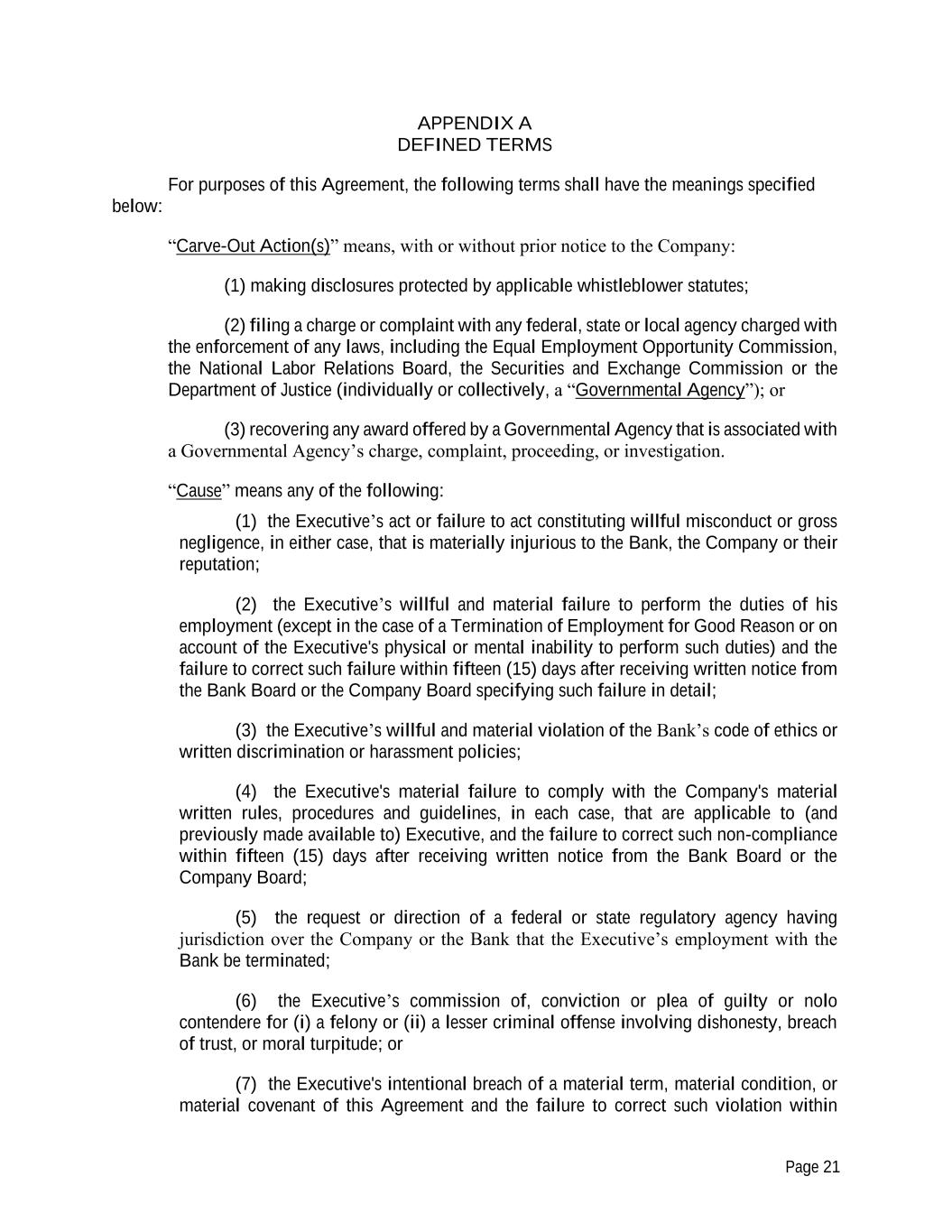 Page 21 APPENDIX A DEFINED TERMS For purposes of this Agreement, the following terms shall have the meanings specified below: “Carve-Out Action(s)” means, with or without prior notice to the Company: (1) making disclosures protected by applicable whistleblower statutes; (2) filing a charge or complaint with any federal, state or local agency charged with the enforcement of any laws, including the Equal Employment Opportunity Commission, the National Labor Relations Board, the Securities and Exchange Commission or the Department of Justice (individually or collectively, a “Governmental Agency”); or (3) recovering any award offered by a Governmental Agency that is associated with a Governmental Agency’s charge, complaint, proceeding, or investigation. “Cause” means any of the following: (1) the Executive’s act or failure to act constituting willful misconduct or gross negligence, in either case, that is materially injurious to the Bank, the Company or their reputation; (2) the Executive’s willful and material failure to perform the duties of his employment (except in the case of a Termination of Employment for Good Reason or on account of the Executive's physical or mental inability to perform such duties) and the failure to correct such failure within fifteen (15) days after receiving written notice from the Bank Board or the Company Board specifying such failure in detail; (3) the Executive’s willful and material violation of the Bank’s code of ethics or written discrimination or harassment policies; (4) the Executive's material failure to comply with the Company's material written rules, procedures and guidelines, in each case, that are applicable to (and previously made available to) Executive, and the failure to correct such non-compliance within fifteen (15) days after receiving written notice from the Bank Board or the Company Board; (5) the request or direction of a federal or state regulatory agency having jurisdiction over the Company or the Bank that the Executive’s employment with the Bank be terminated; (6) the Executive’s commission of, conviction or plea of guilty or nolo contendere for (i) a felony or (ii) a lesser criminal offense involving dishonesty, breach of trust, or moral turpitude; or (7) the Executive's intentional breach of a material term, material condition, or material covenant of this Agreement and the failure to correct such violation within