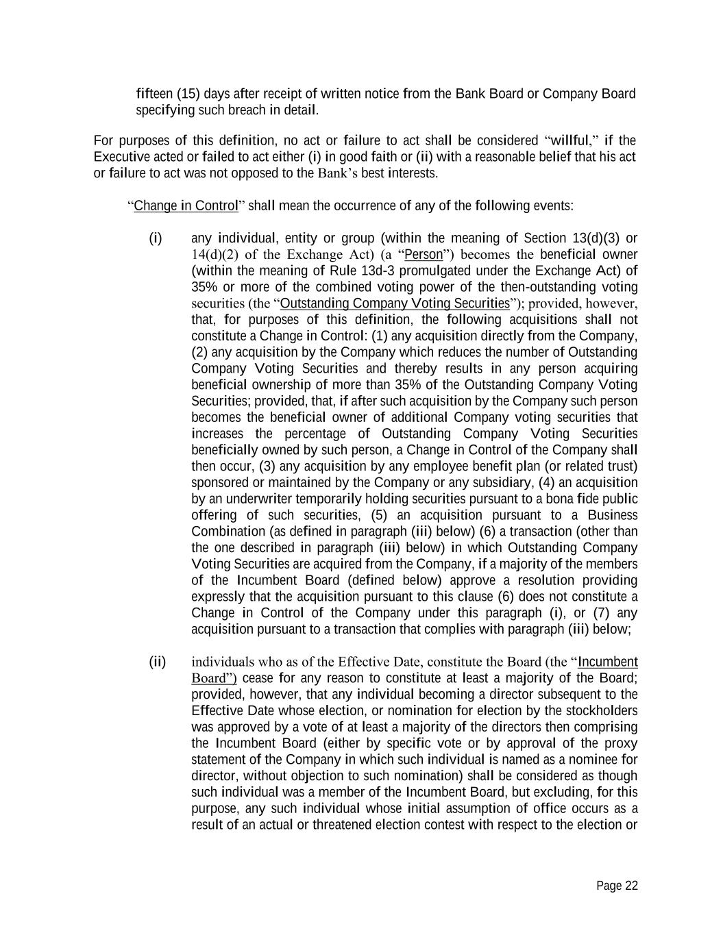 Page 22 fifteen (15) days after receipt of written notice from the Bank Board or Company Board specifying such breach in detail. For purposes of this definition, no act or failure to act shall be considered “willful,” if the Executive acted or failed to act either (i) in good faith or (ii) with a reasonable belief that his act or failure to act was not opposed to the Bank’s best interests. “Change in Control” shall mean the occurrence of any of the following events: (i) any individual, entity or group (within the meaning of Section 13(d)(3) or 14(d)(2) of the Exchange Act) (a “Person”) becomes the beneficial owner (within the meaning of Rule 13d-3 promulgated under the Exchange Act) of 35% or more of the combined voting power of the then-outstanding voting securities (the “Outstanding Company Voting Securities”); provided, however, that, for purposes of this definition, the following acquisitions shall not constitute a Change in Control: (1) any acquisition directly from the Company, (2) any acquisition by the Company which reduces the number of Outstanding Company Voting Securities and thereby results in any person acquiring beneficial ownership of more than 35% of the Outstanding Company Voting Securities; provided, that, if after such acquisition by the Company such person becomes the beneficial owner of additional Company voting securities that increases the percentage of Outstanding Company Voting Securities beneficially owned by such person, a Change in Control of the Company shall then occur, (3) any acquisition by any employee benefit plan (or related trust) sponsored or maintained by the Company or any subsidiary, (4) an acquisition by an underwriter temporarily holding securities pursuant to a bona fide public offering of such securities, (5) an acquisition pursuant to a Business Combination (as defined in paragraph (iii) below) (6) a transaction (other than the one described in paragraph (iii) below) in which Outstanding Company Voting Securities are acquired from the Company, if a majority of the members of the Incumbent Board (defined below) approve a resolution providing expressly that the acquisition pursuant to this clause (6) does not constitute a Change in Control of the Company under this paragraph (i), or (7) any acquisition pursuant to a transaction that complies with paragraph (iii) below; (ii) individuals who as of the Effective Date, constitute the Board (the “Incumbent Board”) cease for any reason to constitute at least a majority of the Board; provided, however, that any individual becoming a director subsequent to the Effective Date whose election, or nomination for election by the stockholders was approved by a vote of at least a majority of the directors then comprising the Incumbent Board (either by specific vote or by approval of the proxy statement of the Company in which such individual is named as a nominee for director, without objection to such nomination) shall be considered as though such individual was a member of the Incumbent Board, but excluding, for this purpose, any such individual whose initial assumption of office occurs as a result of an actual or threatened election contest with respect to the election or