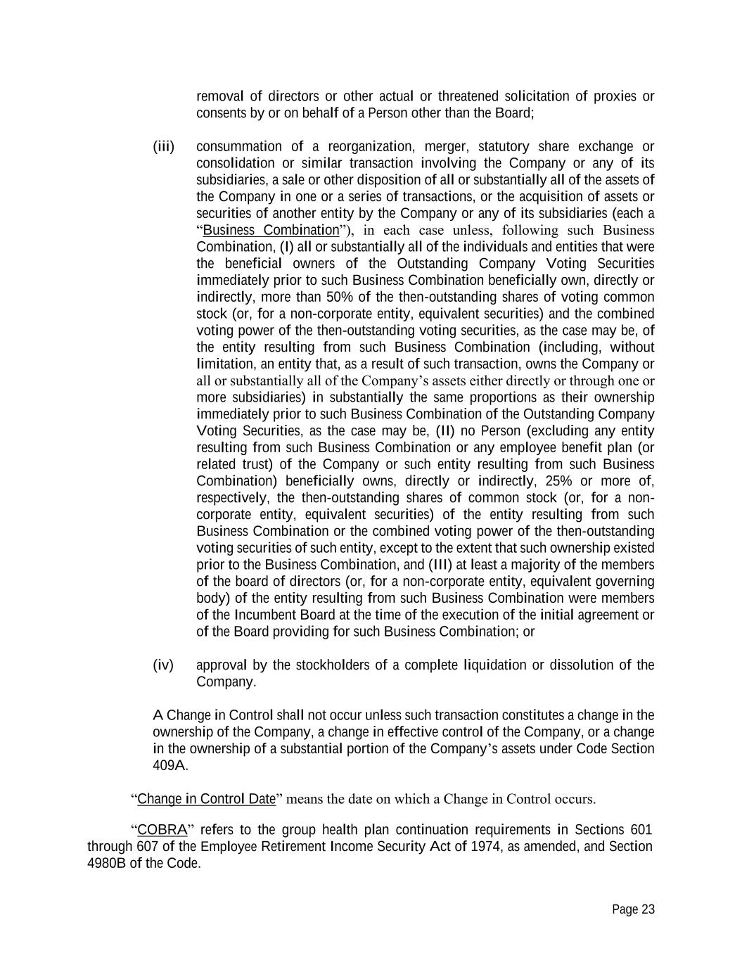 Page 23 removal of directors or other actual or threatened solicitation of proxies or consents by or on behalf of a Person other than the Board; (iii) consummation of a reorganization, merger, statutory share exchange or consolidation or similar transaction involving the Company or any of its subsidiaries, a sale or other disposition of all or substantially all of the assets of the Company in one or a series of transactions, or the acquisition of assets or securities of another entity by the Company or any of its subsidiaries (each a “Business Combination”), in each case unless, following such Business Combination, (I) all or substantially all of the individuals and entities that were the beneficial owners of the Outstanding Company Voting Securities immediately prior to such Business Combination beneficially own, directly or indirectly, more than 50% of the then-outstanding shares of voting common stock (or, for a non-corporate entity, equivalent securities) and the combined voting power of the then-outstanding voting securities, as the case may be, of the entity resulting from such Business Combination (including, without limitation, an entity that, as a result of such transaction, owns the Company or all or substantially all of the Company’s assets either directly or through one or more subsidiaries) in substantially the same proportions as their ownership immediately prior to such Business Combination of the Outstanding Company Voting Securities, as the case may be, (II) no Person (excluding any entity resulting from such Business Combination or any employee benefit plan (or related trust) of the Company or such entity resulting from such Business Combination) beneficially owns, directly or indirectly, 25% or more of, respectively, the then-outstanding shares of common stock (or, for a non- corporate entity, equivalent securities) of the entity resulting from such Business Combination or the combined voting power of the then-outstanding voting securities of such entity, except to the extent that such ownership existed prior to the Business Combination, and (III) at least a majority of the members of the board of directors (or, for a non-corporate entity, equivalent governing body) of the entity resulting from such Business Combination were members of the Incumbent Board at the time of the execution of the initial agreement or of the Board providing for such Business Combination; or (iv) approval by the stockholders of a complete liquidation or dissolution of the Company. A Change in Control shall not occur unless such transaction constitutes a change in the ownership of the Company, a change in effective control of the Company, or a change in the ownership of a substantial portion of the Company’s assets under Code Section 409A. “Change in Control Date” means the date on which a Change in Control occurs. “COBRA” refers to the group health plan continuation requirements in Sections 601 through 607 of the Employee Retirement Income Security Act of 1974, as amended, and Section 4980B of the Code.