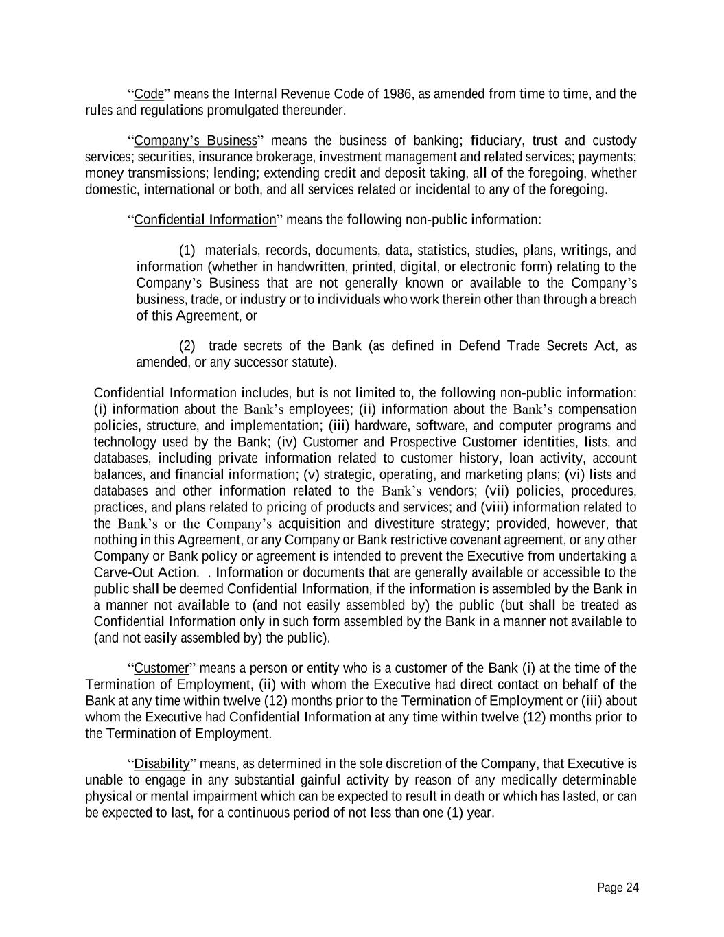 Page 24 “Code” means the Internal Revenue Code of 1986, as amended from time to time, and the rules and regulations promulgated thereunder. “Company’s Business” means the business of banking; fiduciary, trust and custody services; securities, insurance brokerage, investment management and related services; payments; money transmissions; lending; extending credit and deposit taking, all of the foregoing, whether domestic, international or both, and all services related or incidental to any of the foregoing. “Confidential Information” means the following non-public information: (1) materials, records, documents, data, statistics, studies, plans, writings, and information (whether in handwritten, printed, digital, or electronic form) relating to the Company’s Business that are not generally known or available to the Company’s business, trade, or industry or to individuals who work therein other than through a breach of this Agreement, or (2) trade secrets of the Bank (as defined in Defend Trade Secrets Act, as amended, or any successor statute). Confidential Information includes, but is not limited to, the following non-public information: (i) information about the Bank’s employees; (ii) information about the Bank’s compensation policies, structure, and implementation; (iii) hardware, software, and computer programs and technology used by the Bank; (iv) Customer and Prospective Customer identities, lists, and databases, including private information related to customer history, loan activity, account balances, and financial information; (v) strategic, operating, and marketing plans; (vi) lists and databases and other information related to the Bank’s vendors; (vii) policies, procedures, practices, and plans related to pricing of products and services; and (viii) information related to the Bank’s or the Company’s acquisition and divestiture strategy; provided, however, that nothing in this Agreement, or any Company or Bank restrictive covenant agreement, or any other Company or Bank policy or agreement is intended to prevent the Executive from undertaking a Carve-Out Action. . Information or documents that are generally available or accessible to the public shall be deemed Confidential Information, if the information is assembled by the Bank in a manner not available to (and not easily assembled by) the public (but shall be treated as Confidential Information only in such form assembled by the Bank in a manner not available to (and not easily assembled by) the public). “Customer” means a person or entity who is a customer of the Bank (i) at the time of the Termination of Employment, (ii) with whom the Executive had direct contact on behalf of the Bank at any time within twelve (12) months prior to the Termination of Employment or (iii) about whom the Executive had Confidential Information at any time within twelve (12) months prior to the Termination of Employment. “Disability” means, as determined in the sole discretion of the Company, that Executive is unable to engage in any substantial gainful activity by reason of any medically determinable physical or mental impairment which can be expected to result in death or which has lasted, or can be expected to last, for a continuous period of not less than one (1) year.