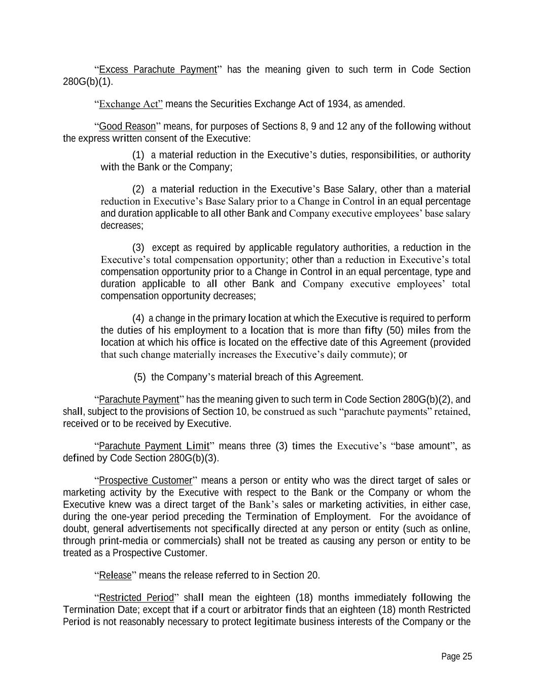 Page 25 “Excess Parachute Payment” has the meaning given to such term in Code Section 280G(b)(1). “Exchange Act” means the Securities Exchange Act of 1934, as amended. “Good Reason” means, for purposes of Sections 8, 9 and 12 any of the following without the express written consent of the Executive: (1) a material reduction in the Executive’s duties, responsibilities, or authority with the Bank or the Company; (2) a material reduction in the Executive’s Base Salary, other than a material reduction in Executive’s Base Salary prior to a Change in Control in an equal percentage and duration applicable to all other Bank and Company executive employees’ base salary decreases; (3) except as required by applicable regulatory authorities, a reduction in the Executive’s total compensation opportunity; other than a reduction in Executive’s total compensation opportunity prior to a Change in Control in an equal percentage, type and duration applicable to all other Bank and Company executive employees’ total compensation opportunity decreases; (4) a change in the primary location at which the Executive is required to perform the duties of his employment to a location that is more than fifty (50) miles from the location at which his office is located on the effective date of this Agreement (provided that such change materially increases the Executive’s daily commute); or (5) the Company’s material breach of this Agreement. “Parachute Payment” has the meaning given to such term in Code Section 280G(b)(2), and shall, subject to the provisions of Section 10, be construed as such “parachute payments” retained, received or to be received by Executive. “Parachute Payment Limit” means three (3) times the Executive’s “base amount”, as defined by Code Section 280G(b)(3). “Prospective Customer” means a person or entity who was the direct target of sales or marketing activity by the Executive with respect to the Bank or the Company or whom the Executive knew was a direct target of the Bank’s sales or marketing activities, in either case, during the one-year period preceding the Termination of Employment. For the avoidance of doubt, general advertisements not specifically directed at any person or entity (such as online, through print-media or commercials) shall not be treated as causing any person or entity to be treated as a Prospective Customer. “Release” means the release referred to in Section 20. “Restricted Period” shall mean the eighteen (18) months immediately following the Termination Date; except that if a court or arbitrator finds that an eighteen (18) month Restricted Period is not reasonably necessary to protect legitimate business interests of the Company or the