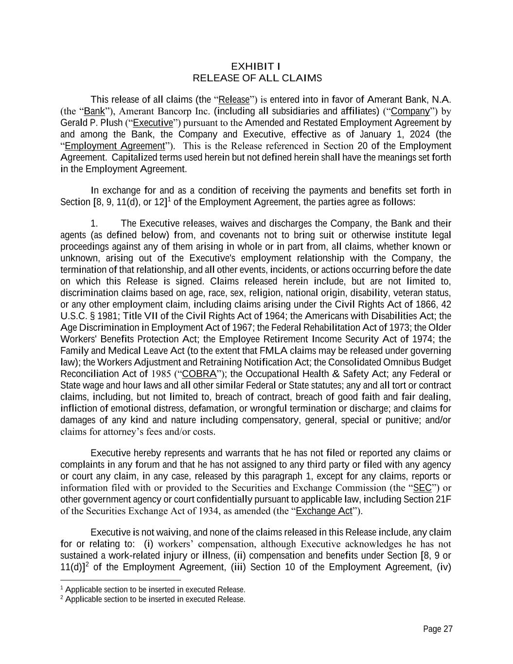 Page 27 EXHIBIT I RELEASE OF ALL CLAIMS This release of all claims (the “Release”) is entered into in favor of Amerant Bank, N.A. (the “Bank”), Amerant Bancorp Inc. (including all subsidiaries and affiliates) (“Company”) by Gerald P. Plush (“Executive”) pursuant to the Amended and Restated Employment Agreement by and among the Bank, the Company and Executive, effective as of January 1, 2024 (the “Employment Agreement”). This is the Release referenced in Section 20 of the Employment Agreement. Capitalized terms used herein but not defined herein shall have the meanings set forth in the Employment Agreement. In exchange for and as a condition of receiving the payments and benefits set forth in Section [8, 9, 11(d), or 12]1 of the Employment Agreement, the parties agree as follows: 1. The Executive releases, waives and discharges the Company, the Bank and their agents (as defined below) from, and covenants not to bring suit or otherwise institute legal proceedings against any of them arising in whole or in part from, all claims, whether known or unknown, arising out of the Executive's employment relationship with the Company, the termination of that relationship, and all other events, incidents, or actions occurring before the date on which this Release is signed. Claims released herein include, but are not limited to, discrimination claims based on age, race, sex, religion, national origin, disability, veteran status, or any other employment claim, including claims arising under the Civil Rights Act of 1866, 42 U.S.C. § 1981; Title VII of the Civil Rights Act of 1964; the Americans with Disabilities Act; the Age Discrimination in Employment Act of 1967; the Federal Rehabilitation Act of 1973; the Older Workers' Benefits Protection Act; the Employee Retirement Income Security Act of 1974; the Family and Medical Leave Act (to the extent that FMLA claims may be released under governing law); the Workers Adjustment and Retraining Notification Act; the Consolidated Omnibus Budget Reconciliation Act of 1985 (“COBRA”); the Occupational Health & Safety Act; any Federal or State wage and hour laws and all other similar Federal or State statutes; any and all tort or contract claims, including, but not limited to, breach of contract, breach of good faith and fair dealing, infliction of emotional distress, defamation, or wrongful termination or discharge; and claims for damages of any kind and nature including compensatory, general, special or punitive; and/or claims for attorney’s fees and/or costs. Executive hereby represents and warrants that he has not filed or reported any claims or complaints in any forum and that he has not assigned to any third party or filed with any agency or court any claim, in any case, released by this paragraph 1, except for any claims, reports or information filed with or provided to the Securities and Exchange Commission (the “SEC”) or other government agency or court confidentially pursuant to applicable law, including Section 21F of the Securities Exchange Act of 1934, as amended (the “Exchange Act”). Executive is not waiving, and none of the claims released in this Release include, any claim for or relating to: (i) workers’ compensation, although Executive acknowledges he has not sustained a work-related injury or illness, (ii) compensation and benefits under Section [8, 9 or 11(d)]2 of the Employment Agreement, (iii) Section 10 of the Employment Agreement, (iv) 1 Applicable section to be inserted in executed Release. 2 Applicable section to be inserted in executed Release.