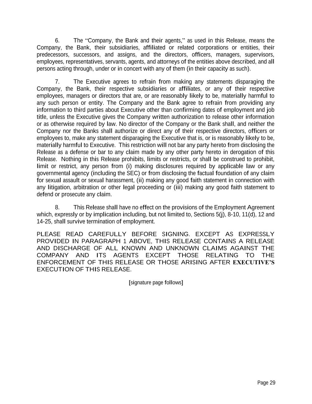 Page 29 6. The “Company, the Bank and their agents,” as used in this Release, means the Company, the Bank, their subsidiaries, affiliated or related corporations or entities, their predecessors, successors, and assigns, and the directors, officers, managers, supervisors, employees, representatives, servants, agents, and attorneys of the entities above described, and all persons acting through, under or in concert with any of them (in their capacity as such). 7. The Executive agrees to refrain from making any statements disparaging the Company, the Bank, their respective subsidiaries or affiliates, or any of their respective employees, managers or directors that are, or are reasonably likely to be, materially harmful to any such person or entity. The Company and the Bank agree to refrain from providing any information to third parties about Executive other than confirming dates of employment and job title, unless the Executive gives the Company written authorization to release other information or as otherwise required by law. No director of the Company or the Bank shall, and neither the Company nor the Banks shall authorize or direct any of their respective directors, officers or employees to, make any statement disparaging the Executive that is, or is reasonably likely to be, materially harmful to Executive. This restriction will not bar any party hereto from disclosing the Release as a defense or bar to any claim made by any other party hereto in derogation of this Release. Nothing in this Release prohibits, limits or restricts, or shall be construed to prohibit, limit or restrict, any person from (i) making disclosures required by applicable law or any governmental agency (including the SEC) or from disclosing the factual foundation of any claim for sexual assault or sexual harassment, (ii) making any good faith statement in connection with any litigation, arbitration or other legal proceeding or (iii) making any good faith statement to defend or prosecute any claim. 8. This Release shall have no effect on the provisions of the Employment Agreement which, expressly or by implication including, but not limited to, Sections 5(j), 8-10, 11(d), 12 and 14-25, shall survive termination of employment. PLEASE READ CAREFULLY BEFORE SIGNING. EXCEPT AS EXPRESSLY PROVIDED IN PARAGRAPH 1 ABOVE, THIS RELEASE CONTAINS A RELEASE AND DISCHARGE OF ALL KNOWN AND UNKNOWN CLAIMS AGAINST THE COMPANY AND ITS AGENTS EXCEPT THOSE RELATING TO THE ENFORCEMENT OF THIS RELEASE OR THOSE ARISING AFTER EXECUTIVE’S EXECUTION OF THIS RELEASE. [signature page follows]
