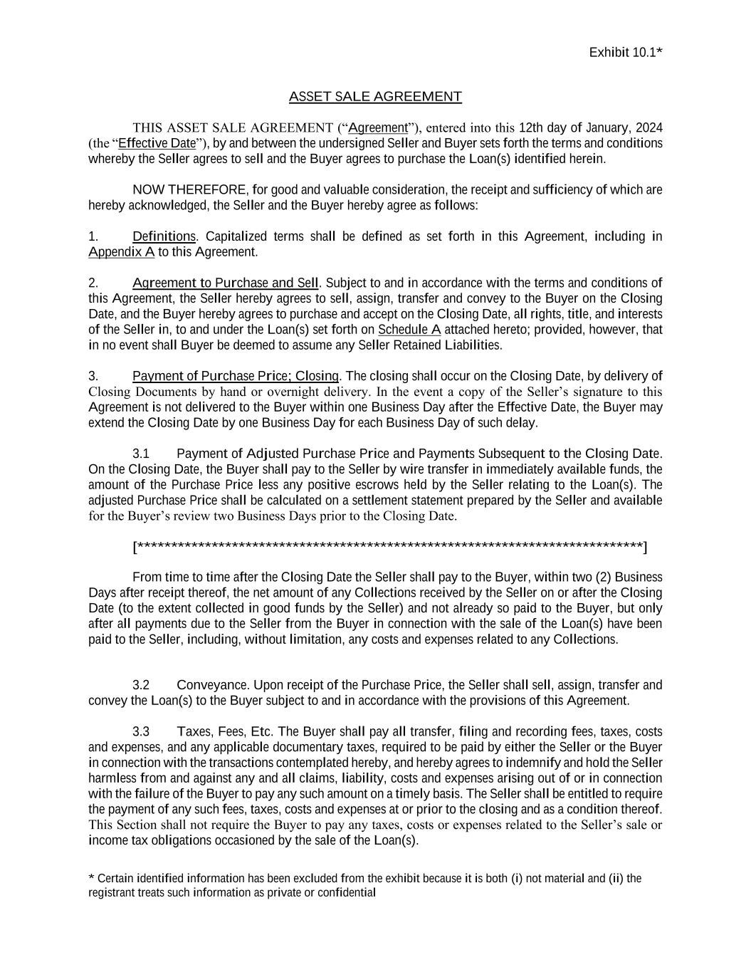 Exhibit 10.1* * Certain identified information has been excluded from the exhibit because it is both (i) not material and (ii) the registrant treats such information as private or confidential ASSET SALE AGREEMENT THIS ASSET SALE AGREEMENT (“Agreement”), entered into this 12th day of January, 2024 (the “Effective Date”), by and between the undersigned Seller and Buyer sets forth the terms and conditions whereby the Seller agrees to sell and the Buyer agrees to purchase the Loan(s) identified herein. NOW THEREFORE, for good and valuable consideration, the receipt and sufficiency of which are hereby acknowledged, the Seller and the Buyer hereby agree as follows: 1. Definitions. Capitalized terms shall be defined as set forth in this Agreement, including in Appendix A to this Agreement. 2. Agreement to Purchase and Sell. Subject to and in accordance with the terms and conditions of this Agreement, the Seller hereby agrees to sell, assign, transfer and convey to the Buyer on the Closing Date, and the Buyer hereby agrees to purchase and accept on the Closing Date, all rights, title, and interests of the Seller in, to and under the Loan(s) set forth on Schedule A attached hereto; provided, however, that in no event shall Buyer be deemed to assume any Seller Retained Liabilities. 3. Payment of Purchase Price; Closing. The closing shall occur on the Closing Date, by delivery of Closing Documents by hand or overnight delivery. In the event a copy of the Seller’s signature to this Agreement is not delivered to the Buyer within one Business Day after the Effective Date, the Buyer may extend the Closing Date by one Business Day for each Business Day of such delay. 3.1 Payment of Adjusted Purchase Price and Payments Subsequent to the Closing Date. On the Closing Date, the Buyer shall pay to the Seller by wire transfer in immediately available funds, the amount of the Purchase Price less any positive escrows held by the Seller relating to the Loan(s). The adjusted Purchase Price shall be calculated on a settlement statement prepared by the Seller and available for the Buyer’s review two Business Days prior to the Closing Date. [***************************************************************************] From time to time after the Closing Date the Seller shall pay to the Buyer, within two (2) Business Days after receipt thereof, the net amount of any Collections received by the Seller on or after the Closing Date (to the extent collected in good funds by the Seller) and not already so paid to the Buyer, but only after all payments due to the Seller from the Buyer in connection with the sale of the Loan(s) have been paid to the Seller, including, without limitation, any costs and expenses related to any Collections. 3.2 Conveyance. Upon receipt of the Purchase Price, the Seller shall sell, assign, transfer and convey the Loan(s) to the Buyer subject to and in accordance with the provisions of this Agreement. 3.3 Taxes, Fees, Etc. The Buyer shall pay all transfer, filing and recording fees, taxes, costs and expenses, and any applicable documentary taxes, required to be paid by either the Seller or the Buyer in connection with the transactions contemplated hereby, and hereby agrees to indemnify and hold the Seller harmless from and against any and all claims, liability, costs and expenses arising out of or in connection with the failure of the Buyer to pay any such amount on a timely basis. The Seller shall be entitled to require the payment of any such fees, taxes, costs and expenses at or prior to the closing and as a condition thereof. This Section shall not require the Buyer to pay any taxes, costs or expenses related to the Seller’s sale or income tax obligations occasioned by the sale of the Loan(s).