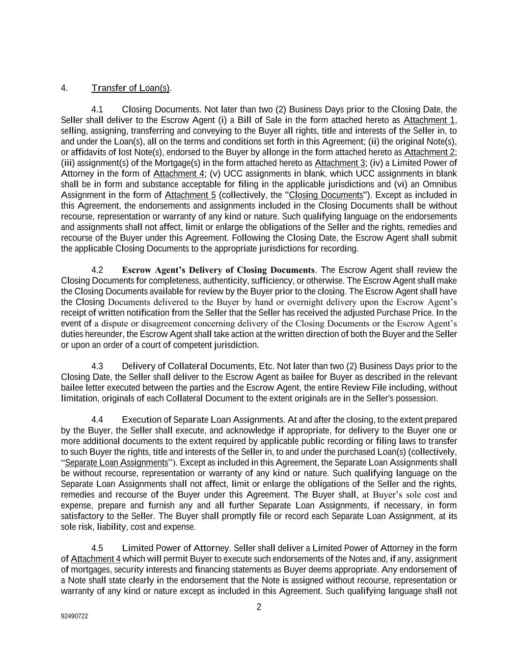 2 92490722 4. Transfer of Loan(s). 4.1 Closing Documents. Not later than two (2) Business Days prior to the Closing Date, the Seller shall deliver to the Escrow Agent (i) a Bill of Sale in the form attached hereto as Attachment 1, selling, assigning, transferring and conveying to the Buyer all rights, title and interests of the Seller in, to and under the Loan(s), all on the terms and conditions set forth in this Agreement; (ii) the original Note(s), or affidavits of lost Note(s), endorsed to the Buyer by allonge in the form attached hereto as Attachment 2; (iii) assignment(s) of the Mortgage(s) in the form attached hereto as Attachment 3; (iv) a Limited Power of Attorney in the form of Attachment 4; (v) UCC assignments in blank, which UCC assignments in blank shall be in form and substance acceptable for filing in the applicable jurisdictions and (vi) an Omnibus Assignment in the form of Attachment 5 (collectively, the "Closing Documents"). Except as included in this Agreement, the endorsements and assignments included in the Closing Documents shall be without recourse, representation or warranty of any kind or nature. Such qualifying language on the endorsements and assignments shall not affect, limit or enlarge the obligations of the Seller and the rights, remedies and recourse of the Buyer under this Agreement. Following the Closing Date, the Escrow Agent shall submit the applicable Closing Documents to the appropriate jurisdictions for recording. 4.2 Escrow Agent’s Delivery of Closing Documents. The Escrow Agent shall review the Closing Documents for completeness, authenticity, sufficiency, or otherwise. The Escrow Agent shall make the Closing Documents available for review by the Buyer prior to the closing. The Escrow Agent shall have the Closing Documents delivered to the Buyer by hand or overnight delivery upon the Escrow Agent’s receipt of written notification from the Seller that the Seller has received the adjusted Purchase Price. In the event of a dispute or disagreement concerning delivery of the Closing Documents or the Escrow Agent’s duties hereunder, the Escrow Agent shall take action at the written direction of both the Buyer and the Seller or upon an order of a court of competent jurisdiction. 4.3 Delivery of Collateral Documents, Etc. Not later than two (2) Business Days prior to the Closing Date, the Seller shall deliver to the Escrow Agent as bailee for Buyer as described in the relevant bailee letter executed between the parties and the Escrow Agent, the entire Review File including, without limitation, originals of each Collateral Document to the extent originals are in the Seller's possession. 4.4 Execution of Separate Loan Assignments. At and after the closing, to the extent prepared by the Buyer, the Seller shall execute, and acknowledge if appropriate, for delivery to the Buyer one or more additional documents to the extent required by applicable public recording or filing laws to transfer to such Buyer the rights, title and interests of the Seller in, to and under the purchased Loan(s) (collectively, “Separate Loan Assignments”). Except as included in this Agreement, the Separate Loan Assignments shall be without recourse, representation or warranty of any kind or nature. Such qualifying language on the Separate Loan Assignments shall not affect, limit or enlarge the obligations of the Seller and the rights, remedies and recourse of the Buyer under this Agreement. The Buyer shall, at Buyer’s sole cost and expense, prepare and furnish any and all further Separate Loan Assignments, if necessary, in form satisfactory to the Seller. The Buyer shall promptly file or record each Separate Loan Assignment, at its sole risk, liability, cost and expense. 4.5 Limited Power of Attorney. Seller shall deliver a Limited Power of Attorney in the form of Attachment 4 which will permit Buyer to execute such endorsements of the Notes and, if any, assignment of mortgages, security interests and financing statements as Buyer deems appropriate. Any endorsement of a Note shall state clearly in the endorsement that the Note is assigned without recourse, representation or warranty of any kind or nature except as included in this Agreement. Such qualifying language shall not