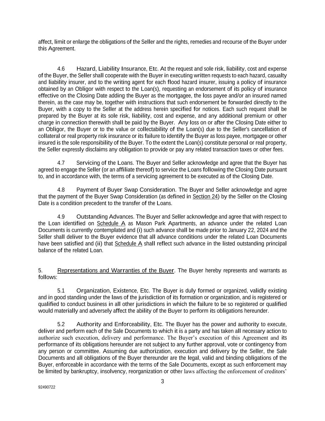 3 92490722 affect, limit or enlarge the obligations of the Seller and the rights, remedies and recourse of the Buyer under this Agreement. 4.6 Hazard, Liability Insurance, Etc. At the request and sole risk, liability, cost and expense of the Buyer, the Seller shall cooperate with the Buyer in executing written requests to each hazard, casualty and liability insurer, and to the writing agent for each flood hazard insurer, issuing a policy of insurance obtained by an Obligor with respect to the Loan(s), requesting an endorsement of its policy of insurance effective on the Closing Date adding the Buyer as the mortgagee, the loss payee and/or an insured named therein, as the case may be, together with instructions that such endorsement be forwarded directly to the Buyer, with a copy to the Seller at the address herein specified for notices. Each such request shall be prepared by the Buyer at its sole risk, liability, cost and expense, and any additional premium or other charge in connection therewith shall be paid by the Buyer. Any loss on or after the Closing Date either to an Obligor, the Buyer or to the value or collectability of the Loan(s) due to the Seller's cancellation of collateral or real property risk insurance or its failure to identify the Buyer as loss payee, mortgagee or other insured is the sole responsibility of the Buyer. To the extent the Loan(s) constitute personal or real property, the Seller expressly disclaims any obligation to provide or pay any related transaction taxes or other fees. 4.7 Servicing of the Loans. The Buyer and Seller acknowledge and agree that the Buyer has agreed to engage the Seller (or an affiliate thereof) to service the Loans following the Closing Date pursuant to, and in accordance with, the terms of a servicing agreement to be executed as of the Closing Date. 4.8 Payment of Buyer Swap Consideration. The Buyer and Seller acknowledge and agree that the payment of the Buyer Swap Consideration (as defined in Section 24) by the Seller on the Closing Date is a condition precedent to the transfer of the Loans. 4.9 Outstanding Advances. The Buyer and Seller acknowledge and agree that with respect to the Loan identified on Schedule A as Mason Park Apartments, an advance under the related Loan Documents is currently contemplated and (i) such advance shall be made prior to January 22, 2024 and the Seller shall deliver to the Buyer evidence that all advance conditions under the related Loan Documents have been satisfied and (ii) that Schedule A shall reflect such advance in the listed outstanding principal balance of the related Loan. 5. Representations and Warranties of the Buyer. The Buyer hereby represents and warrants as follows: 5.1 Organization, Existence, Etc. The Buyer is duly formed or organized, validly existing and in good standing under the laws of the jurisdiction of its formation or organization, and is registered or qualified to conduct business in all other jurisdictions in which the failure to be so registered or qualified would materially and adversely affect the ability of the Buyer to perform its obligations hereunder. 5.2 Authority and Enforceability, Etc. The Buyer has the power and authority to execute, deliver and perform each of the Sale Documents to which it is a party and has taken all necessary action to authorize such execution, delivery and performance. The Buyer’s execution of this Agreement and its performance of its obligations hereunder are not subject to any further approval, vote or contingency from any person or committee. Assuming due authorization, execution and delivery by the Seller, the Sale Documents and all obligations of the Buyer thereunder are the legal, valid and binding obligations of the Buyer, enforceable in accordance with the terms of the Sale Documents, except as such enforcement may be limited by bankruptcy, insolvency, reorganization or other laws affecting the enforcement of creditors’