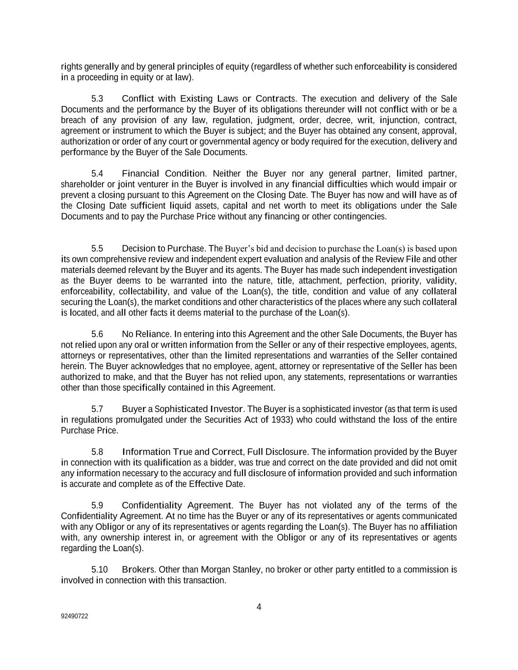 4 92490722 rights generally and by general principles of equity (regardless of whether such enforceability is considered in a proceeding in equity or at law). 5.3 Conflict with Existing Laws or Contracts. The execution and delivery of the Sale Documents and the performance by the Buyer of its obligations thereunder will not conflict with or be a breach of any provision of any law, regulation, judgment, order, decree, writ, injunction, contract, agreement or instrument to which the Buyer is subject; and the Buyer has obtained any consent, approval, authorization or order of any court or governmental agency or body required for the execution, delivery and performance by the Buyer of the Sale Documents. 5.4 Financial Condition. Neither the Buyer nor any general partner, limited partner, shareholder or joint venturer in the Buyer is involved in any financial difficulties which would impair or prevent a closing pursuant to this Agreement on the Closing Date. The Buyer has now and will have as of the Closing Date sufficient liquid assets, capital and net worth to meet its obligations under the Sale Documents and to pay the Purchase Price without any financing or other contingencies. 5.5 Decision to Purchase. The Buyer’s bid and decision to purchase the Loan(s) is based upon its own comprehensive review and independent expert evaluation and analysis of the Review File and other materials deemed relevant by the Buyer and its agents. The Buyer has made such independent investigation as the Buyer deems to be warranted into the nature, title, attachment, perfection, priority, validity, enforceability, collectability, and value of the Loan(s), the title, condition and value of any collateral securing the Loan(s), the market conditions and other characteristics of the places where any such collateral is located, and all other facts it deems material to the purchase of the Loan(s). 5.6 No Reliance. In entering into this Agreement and the other Sale Documents, the Buyer has not relied upon any oral or written information from the Seller or any of their respective employees, agents, attorneys or representatives, other than the limited representations and warranties of the Seller contained herein. The Buyer acknowledges that no employee, agent, attorney or representative of the Seller has been authorized to make, and that the Buyer has not relied upon, any statements, representations or warranties other than those specifically contained in this Agreement. 5.7 Buyer a Sophisticated Investor. The Buyer is a sophisticated investor (as that term is used in regulations promulgated under the Securities Act of 1933) who could withstand the loss of the entire Purchase Price. 5.8 Information True and Correct, Full Disclosure. The information provided by the Buyer in connection with its qualification as a bidder, was true and correct on the date provided and did not omit any information necessary to the accuracy and full disclosure of information provided and such information is accurate and complete as of the Effective Date. 5.9 Confidentiality Agreement. The Buyer has not violated any of the terms of the Confidentiality Agreement. At no time has the Buyer or any of its representatives or agents communicated with any Obligor or any of its representatives or agents regarding the Loan(s). The Buyer has no affiliation with, any ownership interest in, or agreement with the Obligor or any of its representatives or agents regarding the Loan(s). 5.10 Brokers. Other than Morgan Stanley, no broker or other party entitled to a commission is involved in connection with this transaction.