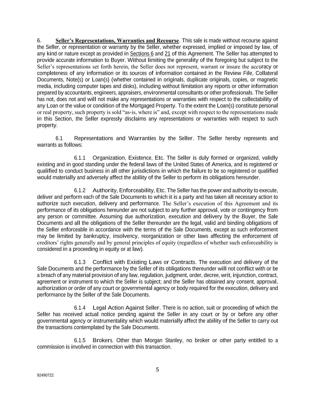5 92490722 6. Seller’s Representations, Warranties and Recourse. This sale is made without recourse against the Seller, or representation or warranty by the Seller, whether expressed, implied or imposed by law, of any kind or nature except as provided in Sections 6 and 21 of this Agreement. The Seller has attempted to provide accurate information to Buyer. Without limiting the generality of the foregoing but subject to the Seller’s representations set forth herein, the Seller does not represent, warrant or insure the accuracy or completeness of any information or its sources of information contained in the Review File, Collateral Documents, Note(s) or Loan(s) (whether contained in originals, duplicate originals, copies, or magnetic media, including computer tapes and disks), including without limitation any reports or other information prepared by accountants, engineers, appraisers, environmental consultants or other professionals. The Seller has not, does not and will not make any representations or warranties with respect to the collectability of any Loan or the value or condition of the Mortgaged Property. To the extent the Loan(s) constitute personal or real property, such property is sold “as-is, where is” and, except with respect to the representations made in this Section, the Seller expressly disclaims any representations or warranties with respect to such property. 6.1 Representations and Warranties by the Seller. The Seller hereby represents and warrants as follows: 6.1.1 Organization, Existence, Etc. The Seller is duly formed or organized, validly existing and in good standing under the federal laws of the United States of America, and is registered or qualified to conduct business in all other jurisdictions in which the failure to be so registered or qualified would materially and adversely affect the ability of the Seller to perform its obligations hereunder. 6.1.2 Authority, Enforceability, Etc. The Seller has the power and authority to execute, deliver and perform each of the Sale Documents to which it is a party and has taken all necessary action to authorize such execution, delivery and performance. The Seller’s execution of this Agreement and its performance of its obligations hereunder are not subject to any further approval, vote or contingency from any person or committee. Assuming due authorization, execution and delivery by the Buyer, the Sale Documents and all the obligations of the Seller thereunder are the legal, valid and binding obligations of the Seller enforceable in accordance with the terms of the Sale Documents, except as such enforcement may be limited by bankruptcy, insolvency, reorganization or other laws affecting the enforcement of creditors’ rights generally and by general principles of equity (regardless of whether such enforceability is considered in a proceeding in equity or at law). 6.1.3 Conflict with Existing Laws or Contracts. The execution and delivery of the Sale Documents and the performance by the Seller of its obligations thereunder will not conflict with or be a breach of any material provision of any law, regulation, judgment, order, decree, writ, injunction, contract, agreement or instrument to which the Seller is subject; and the Seller has obtained any consent, approval, authorization or order of any court or governmental agency or body required for the execution, delivery and performance by the Seller of the Sale Documents. 6.1.4 Legal Action Against Seller. There is no action, suit or proceeding of which the Seller has received actual notice pending against the Seller in any court or by or before any other governmental agency or instrumentality which would materially affect the ability of the Seller to carry out the transactions contemplated by the Sale Documents. 6.1.5 Brokers. Other than Morgan Stanley, no broker or other party entitled to a commission is involved in connection with this transaction.