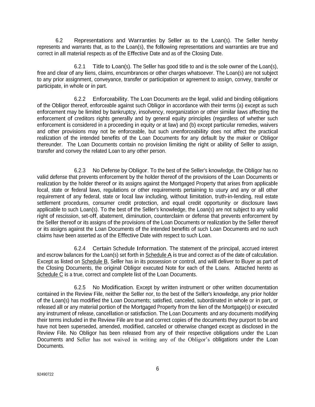 6 92490722 6.2 Representations and Warranties by Seller as to the Loan(s). The Seller hereby represents and warrants that, as to the Loan(s), the following representations and warranties are true and correct in all material respects as of the Effective Date and as of the Closing Date. 6.2.1 Title to Loan(s). The Seller has good title to and is the sole owner of the Loan(s), free and clear of any liens, claims, encumbrances or other charges whatsoever. The Loan(s) are not subject to any prior assignment, conveyance, transfer or participation or agreement to assign, convey, transfer or participate, in whole or in part. 6.2.2 Enforceability. The Loan Documents are the legal, valid and binding obligations of the Obligor thereof, enforceable against such Obligor in accordance with their terms (a) except as such enforcement may be limited by bankruptcy, insolvency, reorganization or other similar laws affecting the enforcement of creditors rights generally and by general equity principles (regardless of whether such enforcement is considered in a proceeding in equity or at law) and (b) except particular remedies, waivers and other provisions may not be enforceable, but such unenforceability does not affect the practical realization of the intended benefits of the Loan Documents for any default by the maker or Obligor thereunder. The Loan Documents contain no provision limiting the right or ability of Seller to assign, transfer and convey the related Loan to any other person. 6.2.3 No Defense by Obligor. To the best of the Seller's knowledge, the Obligor has no valid defense that prevents enforcement by the holder thereof of the provisions of the Loan Documents or realization by the holder thereof or its assigns against the Mortgaged Property that arises from applicable local, state or federal laws, regulations or other requirements pertaining to usury and any or all other requirement of any federal, state or local law including, without limitation, truth-in-lending, real estate settlement procedures, consumer credit protection, and equal credit opportunity or disclosure laws applicable to such Loan(s). To the best of the Seller's knowledge, the Loan(s) are not subject to any valid right of rescission, set-off, abatement, diminution, counterclaim or defense that prevents enforcement by the Seller thereof or its assigns of the provisions of the Loan Documents or realization by the Seller thereof or its assigns against the Loan Documents of the intended benefits of such Loan Documents and no such claims have been asserted as of the Effective Date with respect to such Loan. 6.2.4 Certain Schedule Information. The statement of the principal, accrued interest and escrow balances for the Loan(s) set forth in Schedule A is true and correct as of the date of calculation. Except as listed on Schedule B, Seller has in its possession or control, and will deliver to Buyer as part of the Closing Documents, the original Obligor executed Note for each of the Loans. Attached hereto as Schedule C is a true, correct and complete list of the Loan Documents. 6.2.5 No Modification. Except by written instrument or other written documentation contained in the Review File, neither the Seller nor, to the best of the Seller's knowledge, any prior holder of the Loan(s) has modified the Loan Documents; satisfied, canceled, subordinated in whole or in part, or released all or any material portion of the Mortgaged Property from the lien of the Mortgage(s) or executed any instrument of release, cancellation or satisfaction. The Loan Documents and any documents modifying their terms included in the Review File are true and correct copies of the documents they purport to be and have not been superseded, amended, modified, canceled or otherwise changed except as disclosed in the Review File. No Obligor has been released from any of their respective obligations under the Loan Documents and Seller has not waived in writing any of the Obligor’s obligations under the Loan Documents.