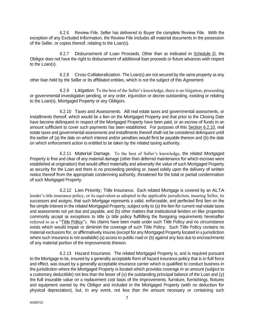 7 92490722 6.2.6 Review File. Seller has delivered to Buyer the complete Review File. With the exception of any Excluded Information, the Review File includes all material documents in the possession of the Seller, or copies thereof, relating to the Loan(s). 6.2.7 Disbursement of Loan Proceeds. Other than as indicated in Schedule D, the Obligor does not have the right to disbursement of additional loan proceeds or future advances with respect to the Loan(s). 6.2.8 Cross-Collateralization. The Loan(s) are not secured by the same property as any other loan held by the Seller or its affiliated entities, which is not the subject of this Agreement. 6.2.9 Litigation. To the best of the Seller’s knowledge, there is no litigation, proceeding or governmental investigation pending, or any order, injunction or decree outstanding, existing or relating to the Loan(s), Mortgaged Property or any Obligors. 6.2.10 Taxes and Assessments. All real estate taxes and governmental assessments, or installments thereof, which would be a lien on the Mortgaged Property and that prior to the Closing Date have become delinquent in respect of the Mortgaged Property have been paid, or an escrow of funds in an amount sufficient to cover such payments has been established. For purposes of this Section 6.2.10, real estate taxes and governmental assessments and installments thereof shall not be considered delinquent until the earlier of (a) the date on which interest and/or penalties would first be payable thereon and (b) the date on which enforcement action is entitled to be taken by the related taxing authority. 6.2.11 Material Damage. To the best of Seller’s knowledge, the related Mortgaged Property is free and clear of any material damage (other than deferred maintenance for which escrows were established at origination) that would affect materially and adversely the value of such Mortgaged Property as security for the Loan and there is no proceeding pending or, based solely upon the delivery of written notice thereof from the appropriate condemning authority, threatened for the total or partial condemnation of such Mortgaged Property. 6.2.12 Lien Priority; Title Insurance. Each related Mortgage is covered by an ALTA lender’s title insurance policy, or its equivalent as adopted in the applicable jurisdiction, insuring Seller, its successors and assigns, that such Mortgage represents a valid, enforceable, and perfected first lien on the fee simple interest in the related Mortgaged Property, subject only to (a) the lien for current real estate taxes and assessments not yet due and payable, and (b) other matters that institutional lenders on like properties commonly accept as exceptions to title (a title policy fulfilling the foregoing requirements hereinafter referred to as a “Title Policy”). No claims have been made under such Title Policy and no circumstance exists which would impair or diminish the coverage of such Title Policy. Such Title Policy contains no material exclusions for, or affirmatively insures (except for any Mortgaged Property located in a jurisdiction where such insurance is not available) (a) access to public road or (b) against any loss due to encroachments of any material portion of the improvements thereon. 6.2.13 Hazard Insurance. The related Mortgaged Property is, and is required pursuant to the Mortgage to be, insured by a generally acceptable form of hazard insurance policy that is in full force and effect, was issued by a generally acceptable insurance carrier which is qualified to conduct business in the jurisdiction where the Mortgaged Property is located which provides coverage in an amount (subject to a customary deductible) not less than the lesser of (x) the outstanding principal balance of the Loan and (y) the full insurable value on a replacement cost basis of the improvements, furniture, furnishings, fixtures and equipment owned by the Obligor and included in the Mortgaged Property (with no deduction for physical depreciation), but, in any event, not less than the amount necessary or containing such