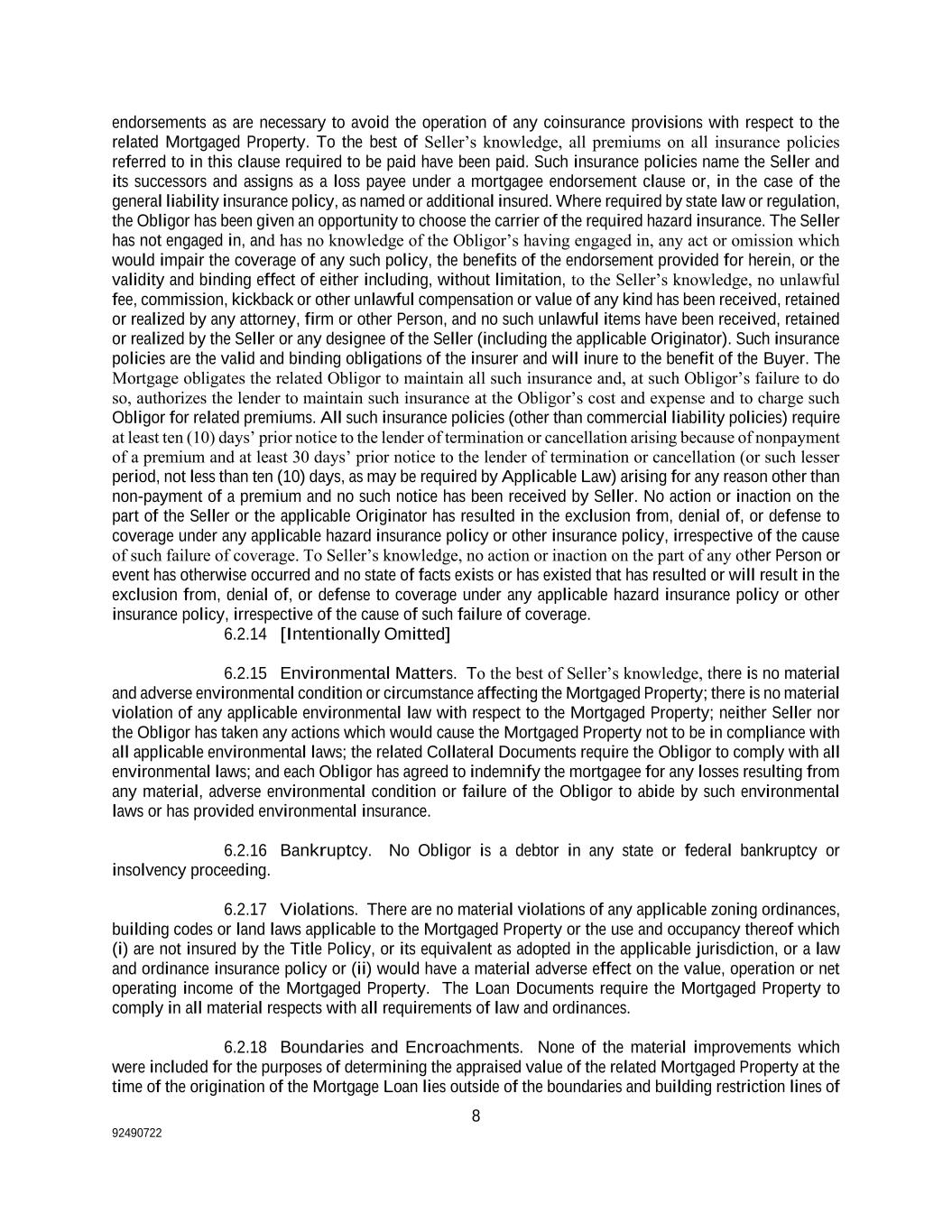8 92490722 endorsements as are necessary to avoid the operation of any coinsurance provisions with respect to the related Mortgaged Property. To the best of Seller’s knowledge, all premiums on all insurance policies referred to in this clause required to be paid have been paid. Such insurance policies name the Seller and its successors and assigns as a loss payee under a mortgagee endorsement clause or, in the case of the general liability insurance policy, as named or additional insured. Where required by state law or regulation, the Obligor has been given an opportunity to choose the carrier of the required hazard insurance. The Seller has not engaged in, and has no knowledge of the Obligor’s having engaged in, any act or omission which would impair the coverage of any such policy, the benefits of the endorsement provided for herein, or the validity and binding effect of either including, without limitation, to the Seller’s knowledge, no unlawful fee, commission, kickback or other unlawful compensation or value of any kind has been received, retained or realized by any attorney, firm or other Person, and no such unlawful items have been received, retained or realized by the Seller or any designee of the Seller (including the applicable Originator). Such insurance policies are the valid and binding obligations of the insurer and will inure to the benefit of the Buyer. The Mortgage obligates the related Obligor to maintain all such insurance and, at such Obligor’s failure to do so, authorizes the lender to maintain such insurance at the Obligor’s cost and expense and to charge such Obligor for related premiums. All such insurance policies (other than commercial liability policies) require at least ten (10) days’ prior notice to the lender of termination or cancellation arising because of nonpayment of a premium and at least 30 days’ prior notice to the lender of termination or cancellation (or such lesser period, not less than ten (10) days, as may be required by Applicable Law) arising for any reason other than non-payment of a premium and no such notice has been received by Seller. No action or inaction on the part of the Seller or the applicable Originator has resulted in the exclusion from, denial of, or defense to coverage under any applicable hazard insurance policy or other insurance policy, irrespective of the cause of such failure of coverage. To Seller’s knowledge, no action or inaction on the part of any other Person or event has otherwise occurred and no state of facts exists or has existed that has resulted or will result in the exclusion from, denial of, or defense to coverage under any applicable hazard insurance policy or other insurance policy, irrespective of the cause of such failure of coverage. 6.2.14 [Intentionally Omitted] 6.2.15 Environmental Matters. To the best of Seller’s knowledge, there is no material and adverse environmental condition or circumstance affecting the Mortgaged Property; there is no material violation of any applicable environmental law with respect to the Mortgaged Property; neither Seller nor the Obligor has taken any actions which would cause the Mortgaged Property not to be in compliance with all applicable environmental laws; the related Collateral Documents require the Obligor to comply with all environmental laws; and each Obligor has agreed to indemnify the mortgagee for any losses resulting from any material, adverse environmental condition or failure of the Obligor to abide by such environmental laws or has provided environmental insurance. 6.2.16 Bankruptcy. No Obligor is a debtor in any state or federal bankruptcy or insolvency proceeding. 6.2.17 Violations. There are no material violations of any applicable zoning ordinances, building codes or land laws applicable to the Mortgaged Property or the use and occupancy thereof which (i) are not insured by the Title Policy, or its equivalent as adopted in the applicable jurisdiction, or a law and ordinance insurance policy or (ii) would have a material adverse effect on the value, operation or net operating income of the Mortgaged Property. The Loan Documents require the Mortgaged Property to comply in all material respects with all requirements of law and ordinances. 6.2.18 Boundaries and Encroachments. None of the material improvements which were included for the purposes of determining the appraised value of the related Mortgaged Property at the time of the origination of the Mortgage Loan lies outside of the boundaries and building restriction lines of