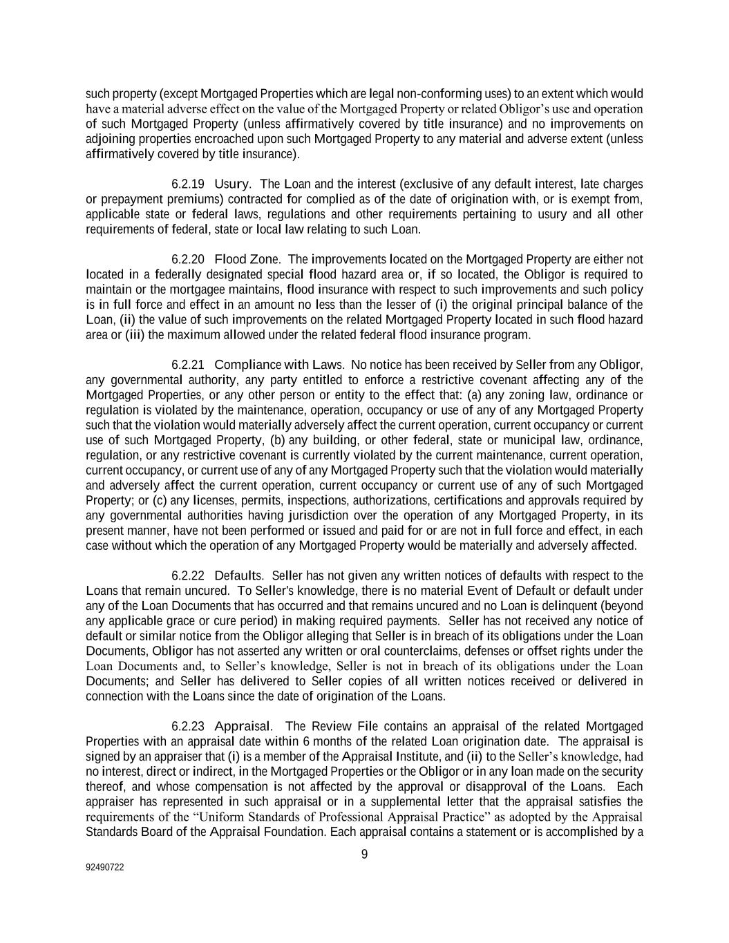 9 92490722 such property (except Mortgaged Properties which are legal non-conforming uses) to an extent which would have a material adverse effect on the value of the Mortgaged Property or related Obligor’s use and operation of such Mortgaged Property (unless affirmatively covered by title insurance) and no improvements on adjoining properties encroached upon such Mortgaged Property to any material and adverse extent (unless affirmatively covered by title insurance). 6.2.19 Usury. The Loan and the interest (exclusive of any default interest, late charges or prepayment premiums) contracted for complied as of the date of origination with, or is exempt from, applicable state or federal laws, regulations and other requirements pertaining to usury and all other requirements of federal, state or local law relating to such Loan. 6.2.20 Flood Zone. The improvements located on the Mortgaged Property are either not located in a federally designated special flood hazard area or, if so located, the Obligor is required to maintain or the mortgagee maintains, flood insurance with respect to such improvements and such policy is in full force and effect in an amount no less than the lesser of (i) the original principal balance of the Loan, (ii) the value of such improvements on the related Mortgaged Property located in such flood hazard area or (iii) the maximum allowed under the related federal flood insurance program. 6.2.21 Compliance with Laws. No notice has been received by Seller from any Obligor, any governmental authority, any party entitled to enforce a restrictive covenant affecting any of the Mortgaged Properties, or any other person or entity to the effect that: (a) any zoning law, ordinance or regulation is violated by the maintenance, operation, occupancy or use of any of any Mortgaged Property such that the violation would materially adversely affect the current operation, current occupancy or current use of such Mortgaged Property, (b) any building, or other federal, state or municipal law, ordinance, regulation, or any restrictive covenant is currently violated by the current maintenance, current operation, current occupancy, or current use of any of any Mortgaged Property such that the violation would materially and adversely affect the current operation, current occupancy or current use of any of such Mortgaged Property; or (c) any licenses, permits, inspections, authorizations, certifications and approvals required by any governmental authorities having jurisdiction over the operation of any Mortgaged Property, in its present manner, have not been performed or issued and paid for or are not in full force and effect, in each case without which the operation of any Mortgaged Property would be materially and adversely affected. 6.2.22 Defaults. Seller has not given any written notices of defaults with respect to the Loans that remain uncured. To Seller's knowledge, there is no material Event of Default or default under any of the Loan Documents that has occurred and that remains uncured and no Loan is delinquent (beyond any applicable grace or cure period) in making required payments. Seller has not received any notice of default or similar notice from the Obligor alleging that Seller is in breach of its obligations under the Loan Documents, Obligor has not asserted any written or oral counterclaims, defenses or offset rights under the Loan Documents and, to Seller’s knowledge, Seller is not in breach of its obligations under the Loan Documents; and Seller has delivered to Seller copies of all written notices received or delivered in connection with the Loans since the date of origination of the Loans. 6.2.23 Appraisal. The Review File contains an appraisal of the related Mortgaged Properties with an appraisal date within 6 months of the related Loan origination date. The appraisal is signed by an appraiser that (i) is a member of the Appraisal Institute, and (ii) to the Seller’s knowledge, had no interest, direct or indirect, in the Mortgaged Properties or the Obligor or in any loan made on the security thereof, and whose compensation is not affected by the approval or disapproval of the Loans. Each appraiser has represented in such appraisal or in a supplemental letter that the appraisal satisfies the requirements of the “Uniform Standards of Professional Appraisal Practice” as adopted by the Appraisal Standards Board of the Appraisal Foundation. Each appraisal contains a statement or is accomplished by a