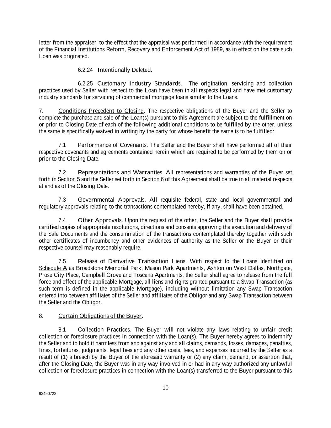 10 92490722 letter from the appraiser, to the effect that the appraisal was performed in accordance with the requirement of the Financial Institutions Reform, Recovery and Enforcement Act of 1989, as in effect on the date such Loan was originated. 6.2.24 Intentionally Deleted. 6.2.25 Customary Industry Standards. The origination, servicing and collection practices used by Seller with respect to the Loan have been in all respects legal and have met customary industry standards for servicing of commercial mortgage loans similar to the Loans. 7. Conditions Precedent to Closing. The respective obligations of the Buyer and the Seller to complete the purchase and sale of the Loan(s) pursuant to this Agreement are subject to the fulfillment on or prior to Closing Date of each of the following additional conditions to be fulfilled by the other, unless the same is specifically waived in writing by the party for whose benefit the same is to be fulfilled: 7.1 Performance of Covenants. The Seller and the Buyer shall have performed all of their respective covenants and agreements contained herein which are required to be performed by them on or prior to the Closing Date. 7.2 Representations and Warranties. All representations and warranties of the Buyer set forth in Section 5 and the Seller set forth in Section 6 of this Agreement shall be true in all material respects at and as of the Closing Date. 7.3 Governmental Approvals. All requisite federal, state and local governmental and regulatory approvals relating to the transactions contemplated hereby, if any, shall have been obtained. 7.4 Other Approvals. Upon the request of the other, the Seller and the Buyer shall provide certified copies of appropriate resolutions, directions and consents approving the execution and delivery of the Sale Documents and the consummation of the transactions contemplated thereby together with such other certificates of incumbency and other evidences of authority as the Seller or the Buyer or their respective counsel may reasonably require. 7.5 Release of Derivative Transaction Liens. With respect to the Loans identified on Schedule A as Broadstone Memorial Park, Mason Park Apartments, Ashton on West Dallas, Northgate, Prose City Place, Campbell Grove and Toscana Apartments, the Seller shall agree to release from the full force and effect of the applicable Mortgage, all liens and rights granted pursuant to a Swap Transaction (as such term is defined in the applicable Mortgage), including without limitation any Swap Transaction entered into between affiliates of the Seller and affiliates of the Obligor and any Swap Transaction between the Seller and the Obligor. 8. Certain Obligations of the Buyer. 8.1 Collection Practices. The Buyer will not violate any laws relating to unfair credit collection or foreclosure practices in connection with the Loan(s). The Buyer hereby agrees to indemnify the Seller and to hold it harmless from and against any and all claims, demands, losses, damages, penalties, fines, forfeitures, judgments, legal fees and any other costs, fees, and expenses incurred by the Seller as a result of (1) a breach by the Buyer of the aforesaid warranty or (2) any claim, demand, or assertion that, after the Closing Date, the Buyer was in any way involved in or had in any way authorized any unlawful collection or foreclosure practices in connection with the Loan(s) transferred to the Buyer pursuant to this
