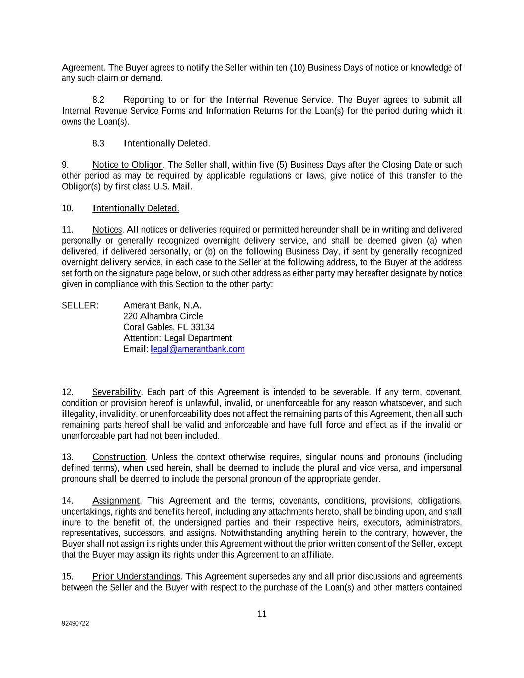 11 92490722 Agreement. The Buyer agrees to notify the Seller within ten (10) Business Days of notice or knowledge of any such claim or demand. 8.2 Reporting to or for the Internal Revenue Service. The Buyer agrees to submit all Internal Revenue Service Forms and Information Returns for the Loan(s) for the period during which it owns the Loan(s). 8.3 Intentionally Deleted. 9. Notice to Obligor. The Seller shall, within five (5) Business Days after the Closing Date or such other period as may be required by applicable regulations or laws, give notice of this transfer to the Obligor(s) by first class U.S. Mail. 10. Intentionally Deleted. 11. Notices. All notices or deliveries required or permitted hereunder shall be in writing and delivered personally or generally recognized overnight delivery service, and shall be deemed given (a) when delivered, if delivered personally, or (b) on the following Business Day, if sent by generally recognized overnight delivery service, in each case to the Seller at the following address, to the Buyer at the address set forth on the signature page below, or such other address as either party may hereafter designate by notice given in compliance with this Section to the other party: SELLER: Amerant Bank, N.A. 220 Alhambra Circle Coral Gables, FL 33134 Attention: Legal Department Email: legal@amerantbank.com 12. Severability. Each part of this Agreement is intended to be severable. If any term, covenant, condition or provision hereof is unlawful, invalid, or unenforceable for any reason whatsoever, and such illegality, invalidity, or unenforceability does not affect the remaining parts of this Agreement, then all such remaining parts hereof shall be valid and enforceable and have full force and effect as if the invalid or unenforceable part had not been included. 13. Construction. Unless the context otherwise requires, singular nouns and pronouns (including defined terms), when used herein, shall be deemed to include the plural and vice versa, and impersonal pronouns shall be deemed to include the personal pronoun of the appropriate gender. 14. Assignment. This Agreement and the terms, covenants, conditions, provisions, obligations, undertakings, rights and benefits hereof, including any attachments hereto, shall be binding upon, and shall inure to the benefit of, the undersigned parties and their respective heirs, executors, administrators, representatives, successors, and assigns. Notwithstanding anything herein to the contrary, however, the Buyer shall not assign its rights under this Agreement without the prior written consent of the Seller, except that the Buyer may assign its rights under this Agreement to an affiliate. 15. Prior Understandings. This Agreement supersedes any and all prior discussions and agreements between the Seller and the Buyer with respect to the purchase of the Loan(s) and other matters contained