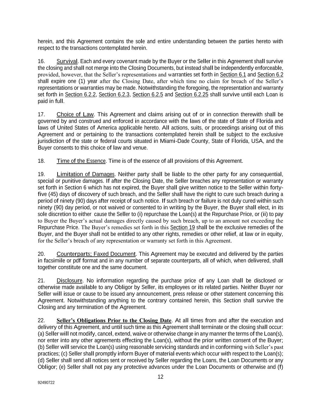 12 92490722 herein, and this Agreement contains the sole and entire understanding between the parties hereto with respect to the transactions contemplated herein. 16. Survival. Each and every covenant made by the Buyer or the Seller in this Agreement shall survive the closing and shall not merge into the Closing Documents, but instead shall be independently enforceable, provided, however, that the Seller’s representations and warranties set forth in Section 6.1 and Section 6.2 shall expire one (1) year after the Closing Date, after which time no claim for breach of the Seller’s representations or warranties may be made. Notwithstanding the foregoing, the representation and warranty set forth in Section 6.2.2, Section 6.2.3, Section 6.2.5 and Section 6.2.25 shall survive until each Loan is paid in full. 17. Choice of Law. This Agreement and claims arising out of or in connection therewith shall be governed by and construed and enforced in accordance with the laws of the state of State of Florida and laws of United States of America applicable hereto. All actions, suits, or proceedings arising out of this Agreement and or pertaining to the transactions contemplated herein shall be subject to the exclusive jurisdiction of the state or federal courts situated in Miami-Dade County, State of Florida, USA, and the Buyer consents to this choice of law and venue. 18. Time of the Essence. Time is of the essence of all provisions of this Agreement. 19. Limitation of Damages. Neither party shall be liable to the other party for any consequential, special or punitive damages. If after the Closing Date, the Seller breaches any representation or warranty set forth in Section 6 which has not expired, the Buyer shall give written notice to the Seller within forty- five (45) days of discovery of such breach, and the Seller shall have the right to cure such breach during a period of ninety (90) days after receipt of such notice. If such breach or failure is not duly cured within such ninety (90) day period, or not waived or consented to in writing by the Buyer, the Buyer shall elect, in its sole discretion to either cause the Seller to (i) repurchase the Loan(s) at the Repurchase Price, or (ii) to pay to Buyer the Buyer’s actual damages directly caused by such breach, up to an amount not exceeding the Repurchase Price. The Buyer’s remedies set forth in this Section 19 shall be the exclusive remedies of the Buyer, and the Buyer shall not be entitled to any other rights, remedies or other relief, at law or in equity, for the Seller’s breach of any representation or warranty set forth in this Agreement. 20. Counterparts; Faxed Document. This Agreement may be executed and delivered by the parties in facsimile or pdf format and in any number of separate counterparts, all of which, when delivered, shall together constitute one and the same document. 21. Disclosure. No information regarding the purchase price of any Loan shall be disclosed or otherwise made available to any Obligor by Seller, its employees or its related parties. Neither Buyer nor Seller will issue or cause to be issued any announcement, press release or other statement concerning this Agreement. Notwithstanding anything to the contrary contained herein, this Section shall survive the Closing and any termination of the Agreement. 22. Seller’s Obligations Prior to the Closing Date. At all times from and after the execution and delivery of this Agreement, and until such time as this Agreement shall terminate or the closing shall occur: (a) Seller will not modify, cancel, extend, waive or otherwise change in any manner the terms of the Loan(s), nor enter into any other agreements effecting the Loan(s), without the prior written consent of the Buyer; (b) Seller will service the Loan(s) using reasonable servicing standards and in conforming with Seller’s past practices; (c) Seller shall promptly inform Buyer of material events which occur with respect to the Loan(s); (d) Seller shall send all notices sent or received by Seller regarding the Loans, the Loan Documents or any Obligor; (e) Seller shall not pay any protective advances under the Loan Documents or otherwise and (f)