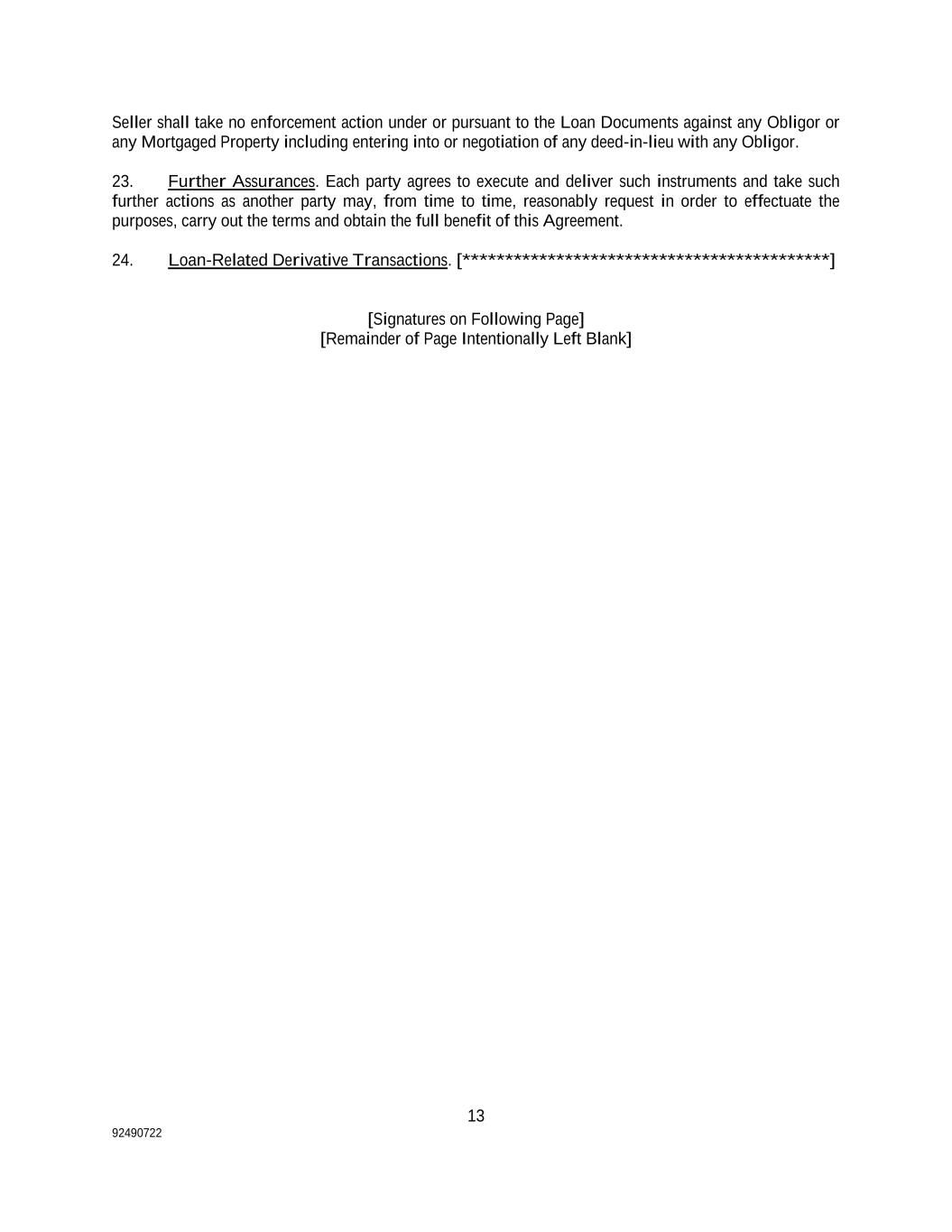 13 92490722 Seller shall take no enforcement action under or pursuant to the Loan Documents against any Obligor or any Mortgaged Property including entering into or negotiation of any deed-in-lieu with any Obligor. 23. Further Assurances. Each party agrees to execute and deliver such instruments and take such further actions as another party may, from time to time, reasonably request in order to effectuate the purposes, carry out the terms and obtain the full benefit of this Agreement. 24. Loan-Related Derivative Transactions. [*******************************************] [Signatures on Following Page] [Remainder of Page Intentionally Left Blank]