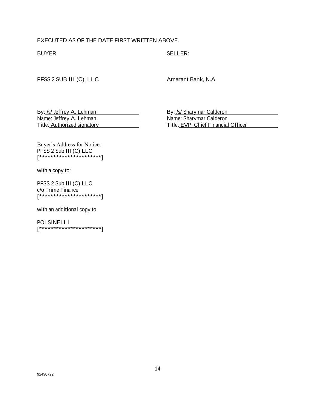 14 92490722 EXECUTED AS OF THE DATE FIRST WRITTEN ABOVE. BUYER: SELLER: PFSS 2 SUB III (C), LLC Amerant Bank, N.A. By: /s/ Jeffrey A. Lehman By: /s/ Sharymar Calderon Name: Jeffrey A. Lehman Name: Sharymar Calderon Title: Authorized signatory Title: EVP, Chief Financial Officer Buyer’s Address for Notice: PFSS 2 Sub III (C) LLC [**********************] with a copy to: PFSS 2 Sub III (C) LLC c/o Prime Finance [**********************] with an additional copy to: POLSINELLI [**********************]