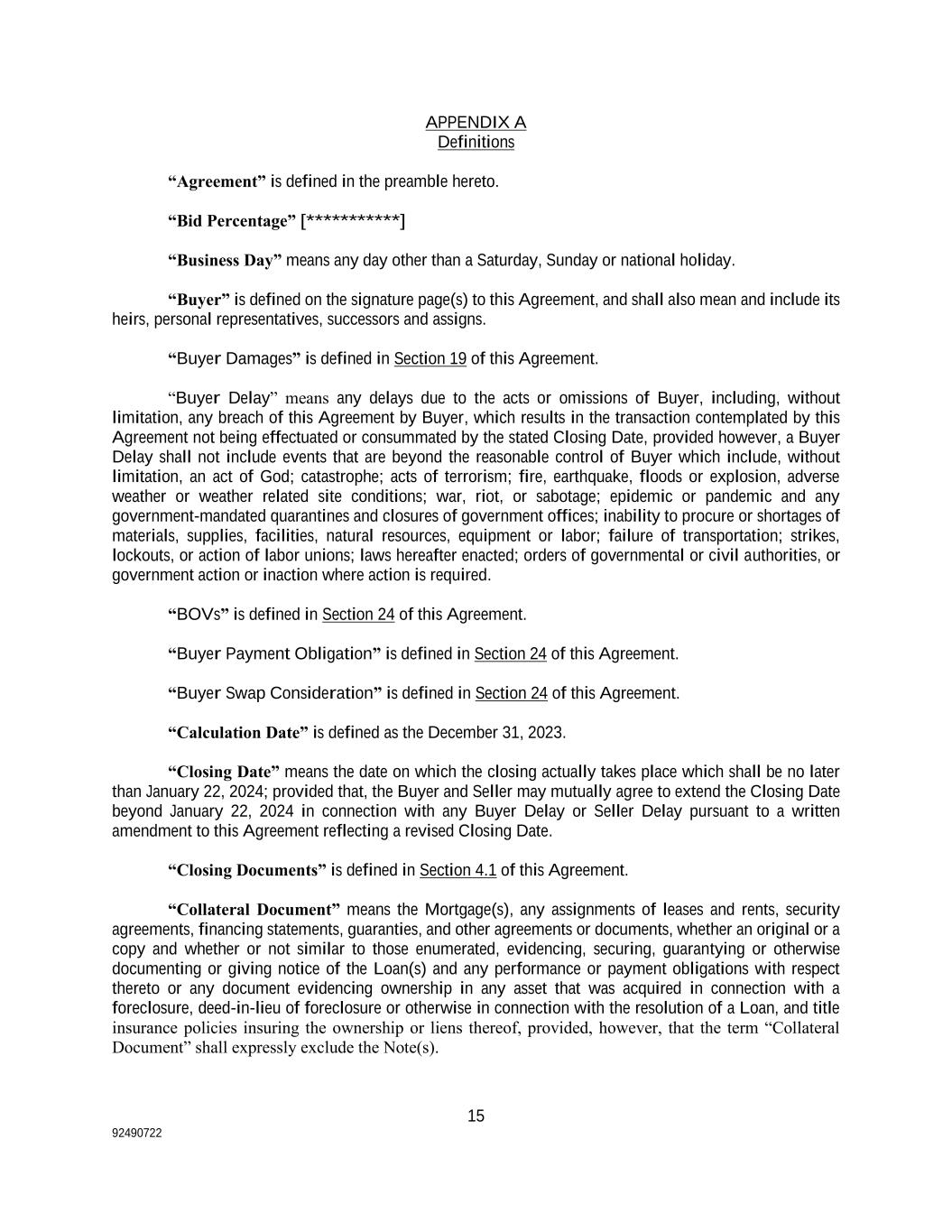 15 92490722 APPENDIX A Definitions “Agreement” is defined in the preamble hereto. “Bid Percentage” [***********] “Business Day” means any day other than a Saturday, Sunday or national holiday. “Buyer” is defined on the signature page(s) to this Agreement, and shall also mean and include its heirs, personal representatives, successors and assigns. “Buyer Damages” is defined in Section 19 of this Agreement. “Buyer Delay” means any delays due to the acts or omissions of Buyer, including, without limitation, any breach of this Agreement by Buyer, which results in the transaction contemplated by this Agreement not being effectuated or consummated by the stated Closing Date, provided however, a Buyer Delay shall not include events that are beyond the reasonable control of Buyer which include, without limitation, an act of God; catastrophe; acts of terrorism; fire, earthquake, floods or explosion, adverse weather or weather related site conditions; war, riot, or sabotage; epidemic or pandemic and any government-mandated quarantines and closures of government offices; inability to procure or shortages of materials, supplies, facilities, natural resources, equipment or labor; failure of transportation; strikes, lockouts, or action of labor unions; laws hereafter enacted; orders of governmental or civil authorities, or government action or inaction where action is required. “BOVs” is defined in Section 24 of this Agreement. “Buyer Payment Obligation” is defined in Section 24 of this Agreement. “Buyer Swap Consideration” is defined in Section 24 of this Agreement. “Calculation Date” is defined as the December 31, 2023. “Closing Date” means the date on which the closing actually takes place which shall be no later than January 22, 2024; provided that, the Buyer and Seller may mutually agree to extend the Closing Date beyond January 22, 2024 in connection with any Buyer Delay or Seller Delay pursuant to a written amendment to this Agreement reflecting a revised Closing Date. “Closing Documents” is defined in Section 4.1 of this Agreement. “Collateral Document” means the Mortgage(s), any assignments of leases and rents, security agreements, financing statements, guaranties, and other agreements or documents, whether an original or a copy and whether or not similar to those enumerated, evidencing, securing, guarantying or otherwise documenting or giving notice of the Loan(s) and any performance or payment obligations with respect thereto or any document evidencing ownership in any asset that was acquired in connection with a foreclosure, deed-in-lieu of foreclosure or otherwise in connection with the resolution of a Loan, and title insurance policies insuring the ownership or liens thereof, provided, however, that the term “Collateral Document” shall expressly exclude the Note(s).
